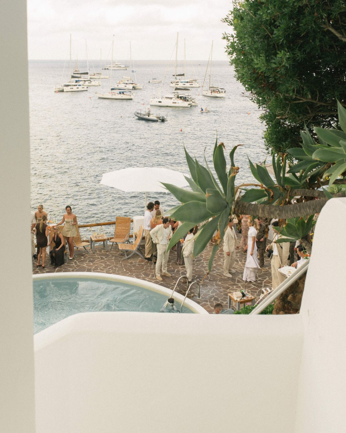 Guests moved to the poolside for cocktail hour, enjoying Italian canapés and bespoke cocktails adorned with ‘The Ferraros’ custom ice cubes, all against the breathtaking backdrop of the glistening water and the sun setting over the distant island.