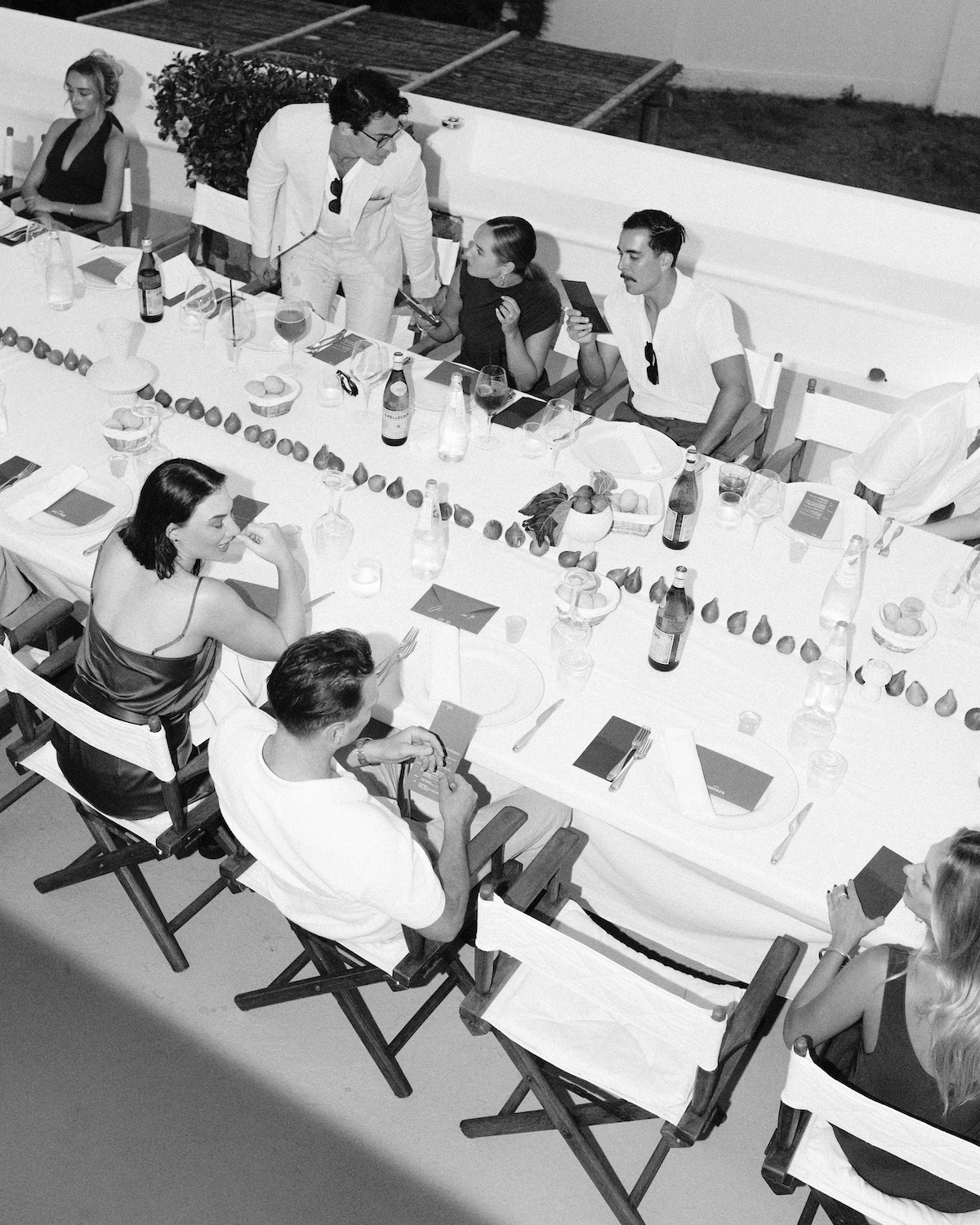 While guests lingered poolside for cocktail hour, our planners and the Hotel Cincotta team transformed the ceremony space into an intimate reception setting. A single, beautifully styled long table took centre stage—no flowers, just details that felt authentically us. Le Labo candles, brought out and lit at sunset, filled the air with the scent we wear at home, while Marloe Marloe vases—also found throughout our house—lined the table, interwoven with a trail of fresh figs. The setting felt deeply personal, a reflection of who we are and what we love.