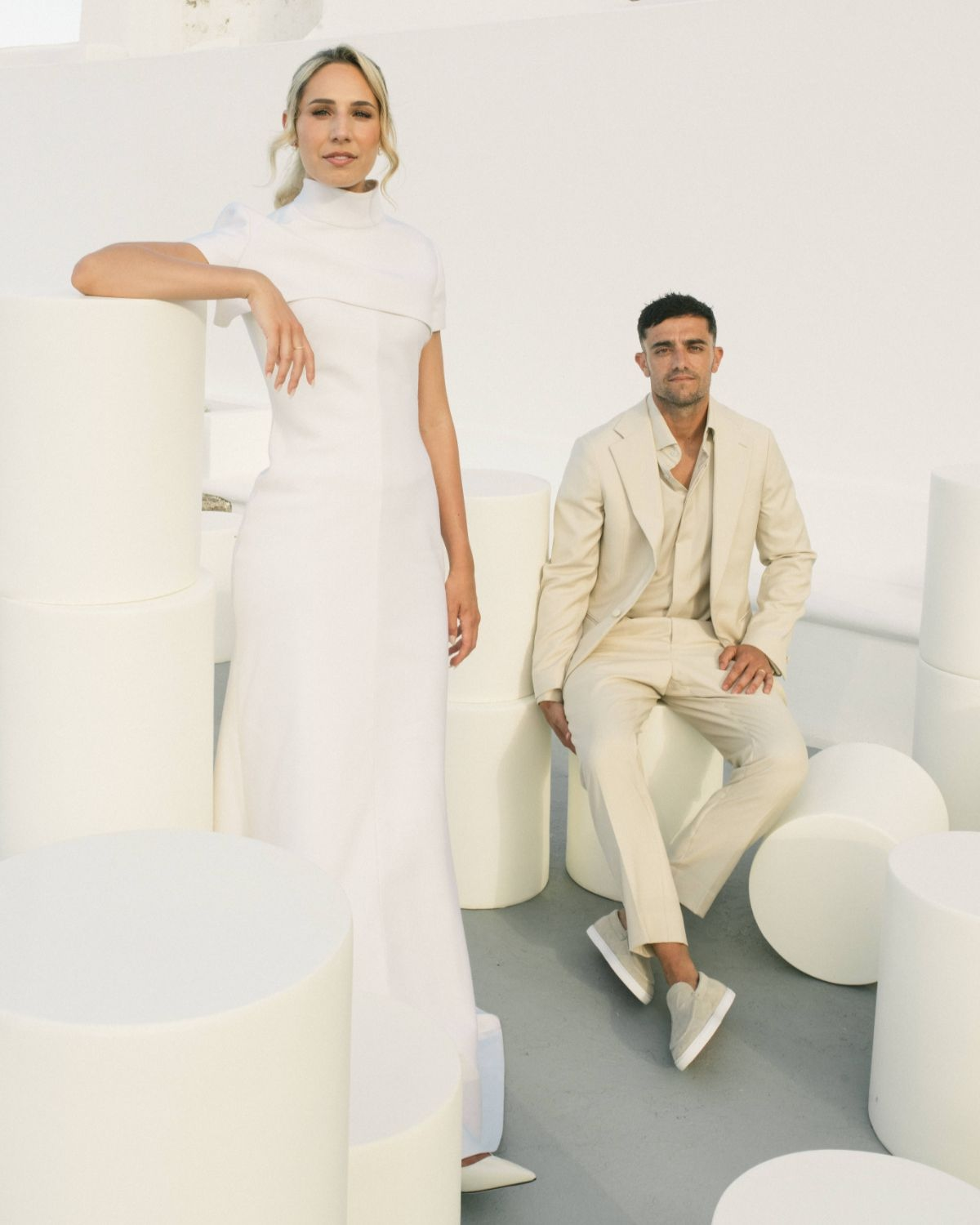 For our wedding day, I wore a custom J’Aton Couture gown, paired with Jimmy Choo heels, bespoke Matthew Ely jewellery, and Michael Hill earrings. My final look of the night featured a treasured heirloom—a gold necklace originally made in my Nonna’s hometown, passed down from my mum. Designing the gown with Jacob at J’Aton was such a special experience. I wanted something timeless yet fashion-forward—structured but effortless—and together we created a four-piece look that evolved throughout the day. The ceremony began with a pinched-bust dress, tie-back corset, and high-neck bolero embroidered with “Più vita con te”—“more life with you.” For the reception, I removed the bolero for a cleaner silhouette and later changed into my final party look: the corset paired with a low-rise mini skirt. As Jacob described it, the design was “bridal meets sculptural minimalism”—a quiet boldness that blended emotion, elegance, and edge.