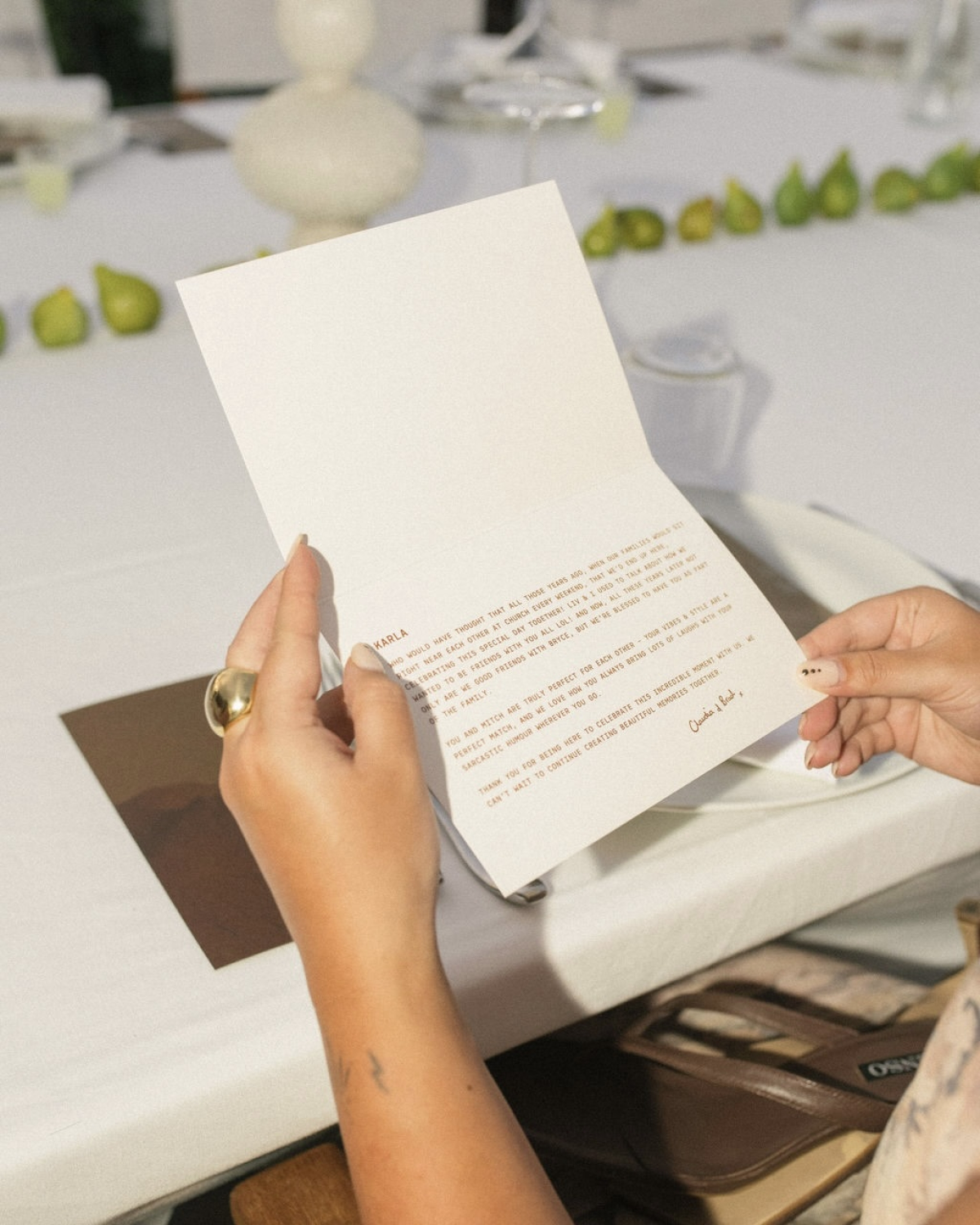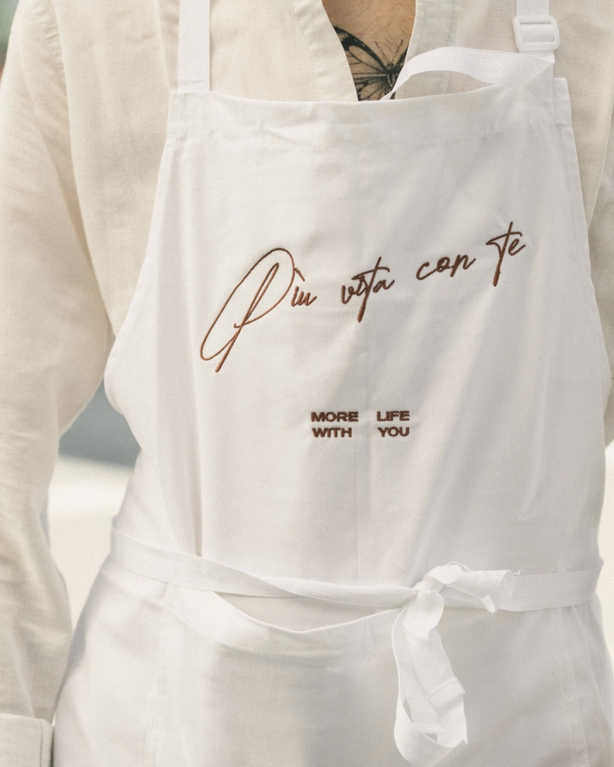 As guests took their seats, they found a handwritten love letter from us waiting at their place. It was a nod to the way Brad proposed—a moment we wanted to share with everyone who means the world to us. There wasn’t a dry eye in the room. Later, guests discovered the Smoke & Spirits bar—a curated corner offering cigars, cigarettes, and cocktails, complete with a YSL lighter for a touch of indulgence. Even the waiters wore custom aprons embroidered with Più vita con te(“more life with you”)—a subtle thread tying our story through every detail of the day.
