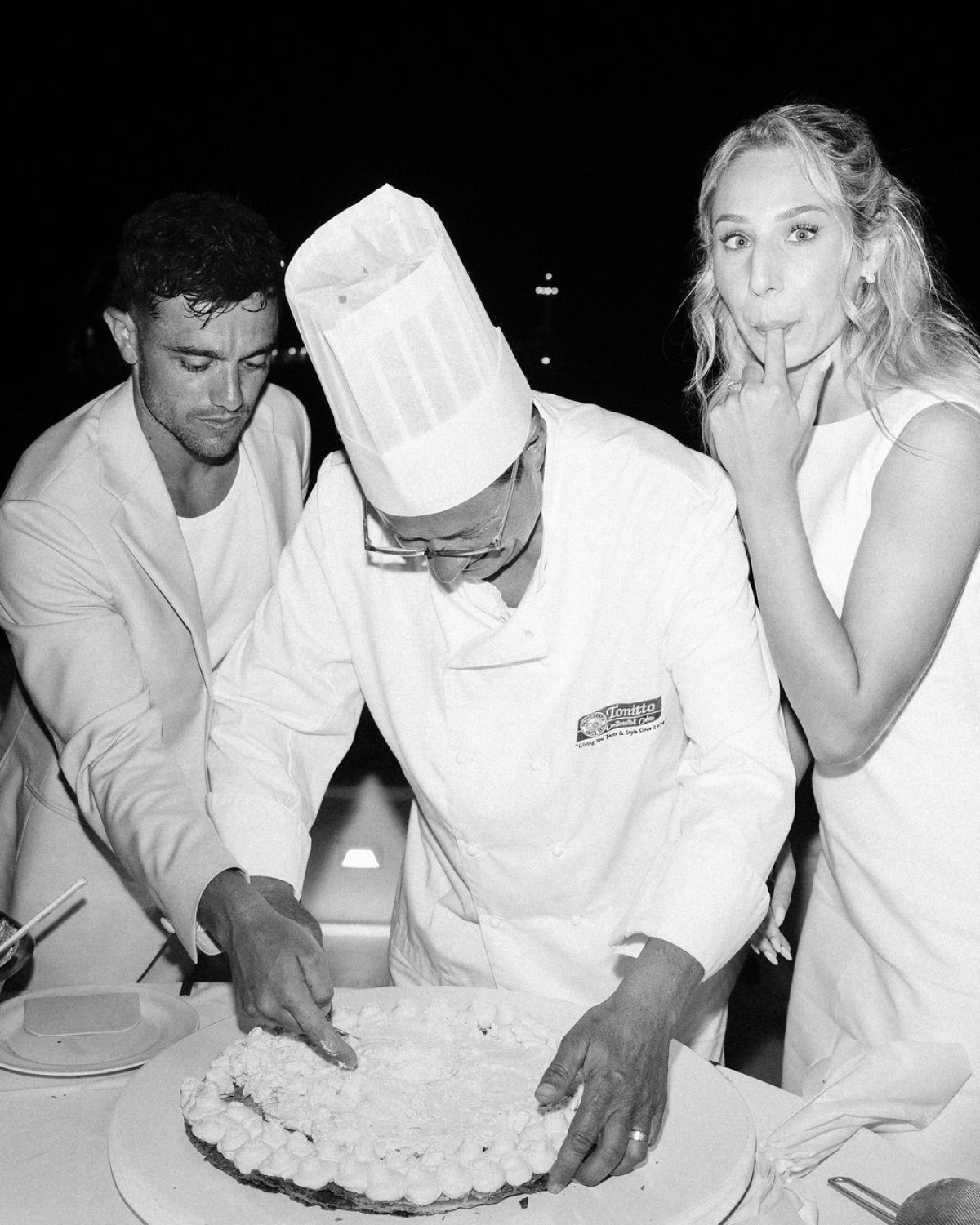 The morning began quietly, with Brad and I slipping away for an early swim before the day unfolded—just the two of us, soon joined by our bridal party. It was the perfect, grounding start to what would become the most unforgettable day. Getting ready with just Mum was another moment I’ll never forget—the calm before the celebration. Afterward, revealing my dress to my bridesmaids and immediate family was filled with emotion—a shared moment that felt both intimate and electric. Our guests arrived dressed to our “shades of beige” dress code, creating the most effortlessly beautiful palette and perfect photos throughout the day. Before guests entered the reception, Brad and I took a private moment to see the space together. After months of planning, finally standing in the room we’d imagined for so long was pure magic. One of the most meaningful moments of the night came later—our wedding cake.