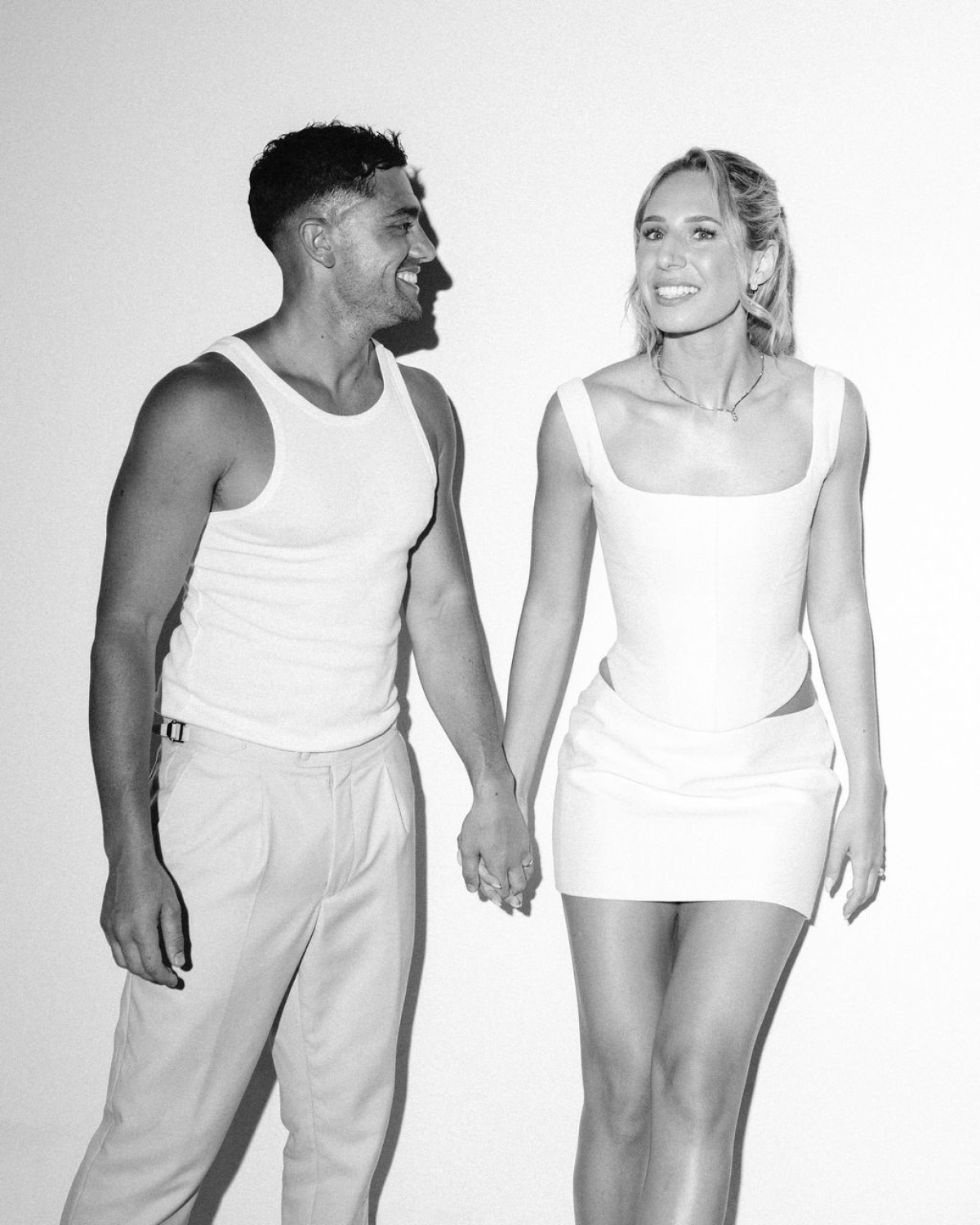 There, another note awaited, leading me to a nail appointment. Then, back home, I found a Christopher Esber outfit carefully laid out for me, along with one final letter: my mum would be picking me up to take me to Brad. After a heartfelt drive with my mum, I arrived at Herah’s Beach in Austinmer. I walked along the rocky coastline until I turned a corner and found Brad waiting—with a bottle of champagne, a platter, and a ring. With the ocean behind us, he dropped to one knee and asked me to marry him—marking the beginning of our next big adventure together.