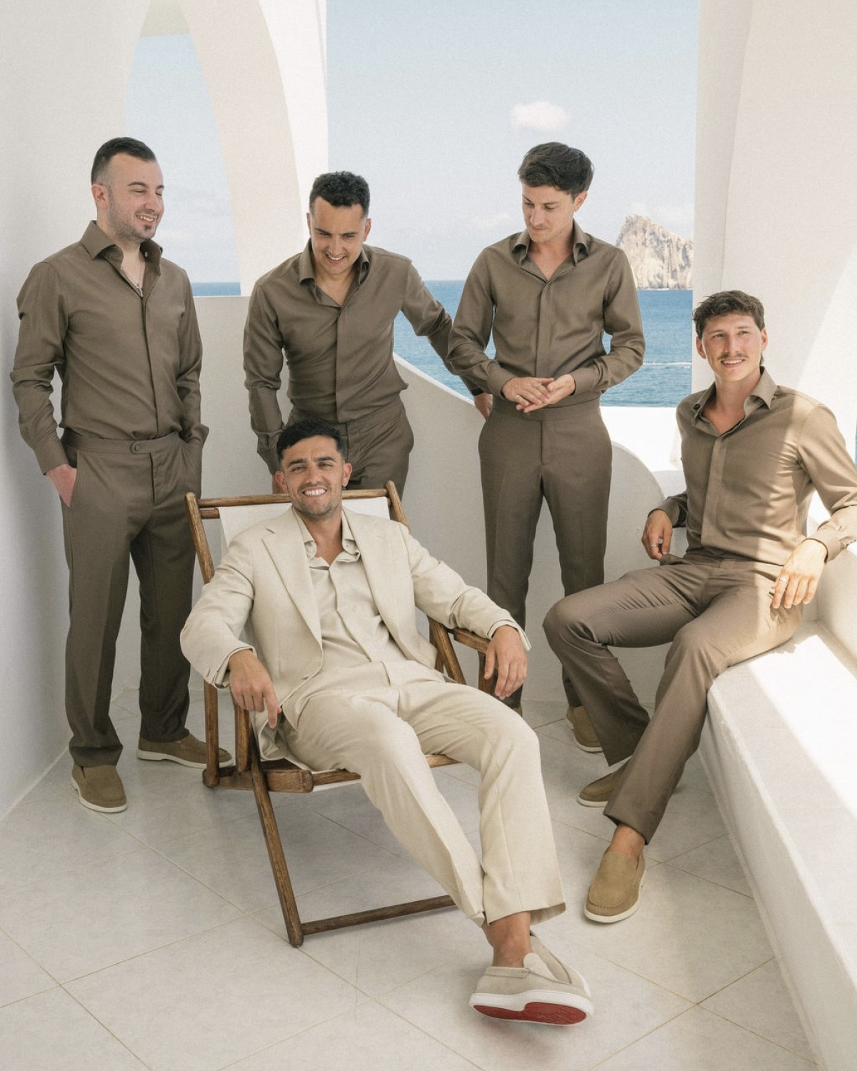 For the bridesmaids, I wanted something that hadn’t been done before. The girls wore custom-made beige A-line mini dresses with Jimmy Choo heels, their hair in sleek buns finished with gold ear cuffs. Similarly, the groomsmen wore custom Brent Wilson suit pants and shirts, both crafted from the same brown fabric—a sleek, modern take on classic tailoring, perfectly suited to the island setting.