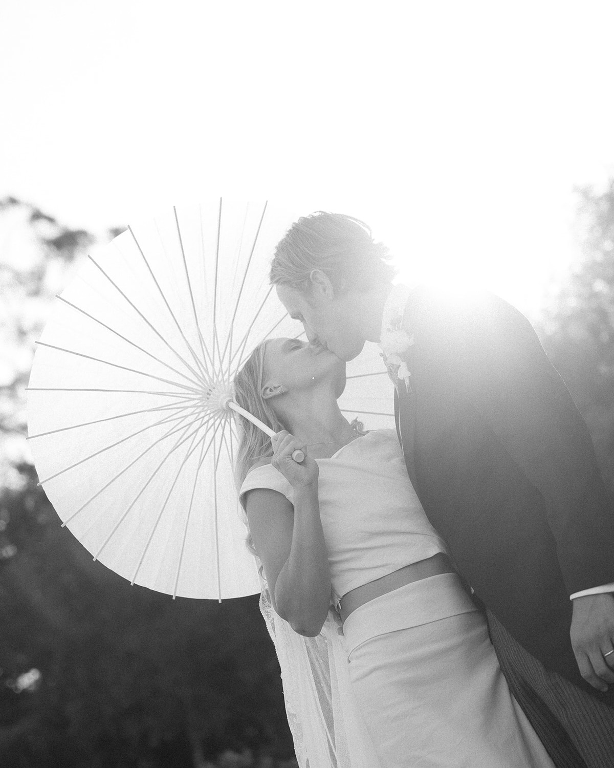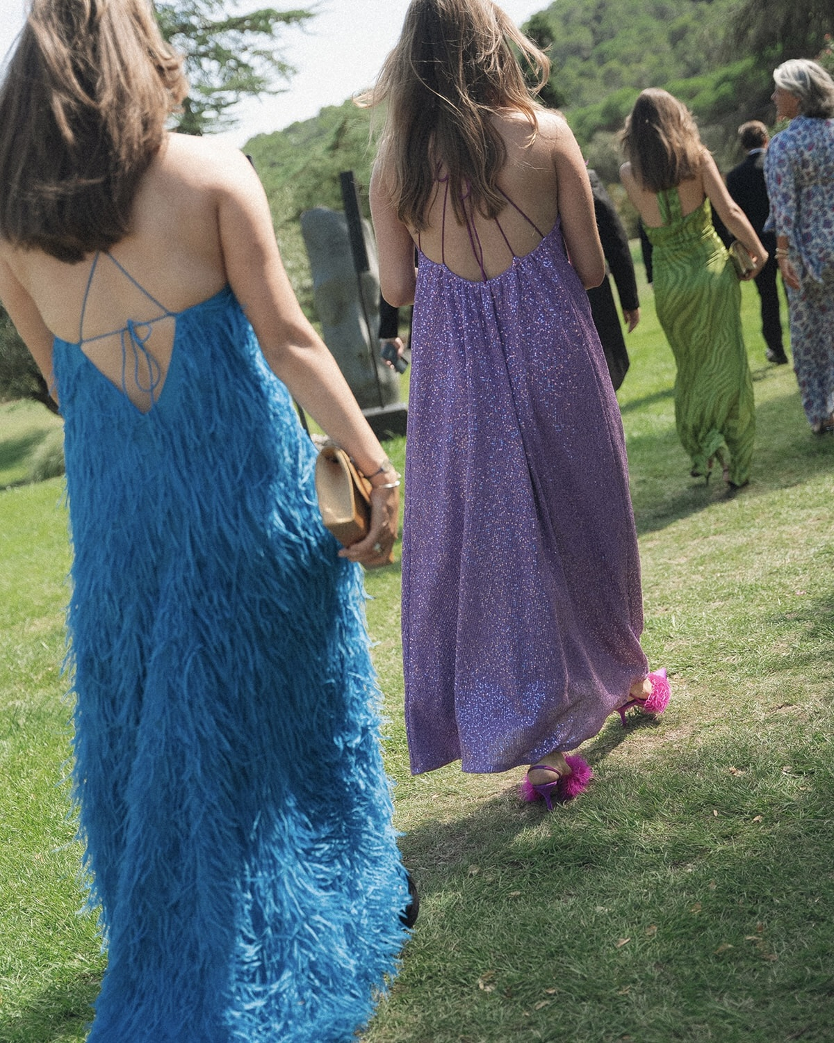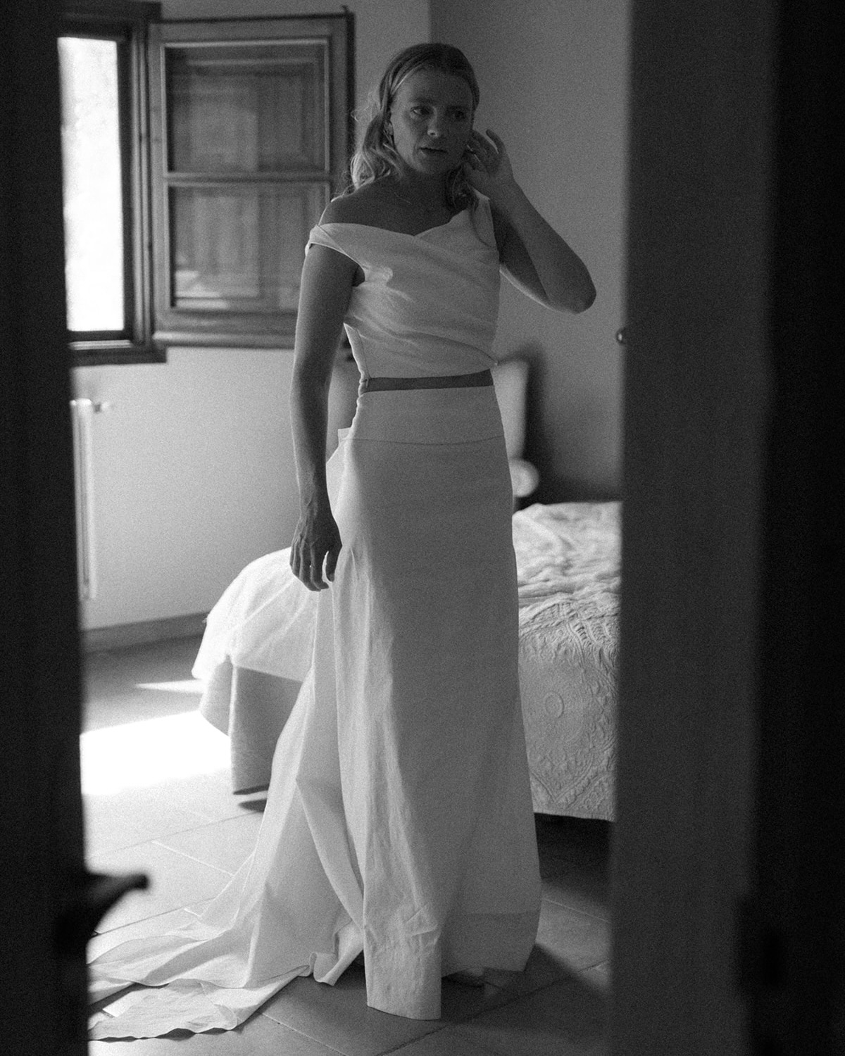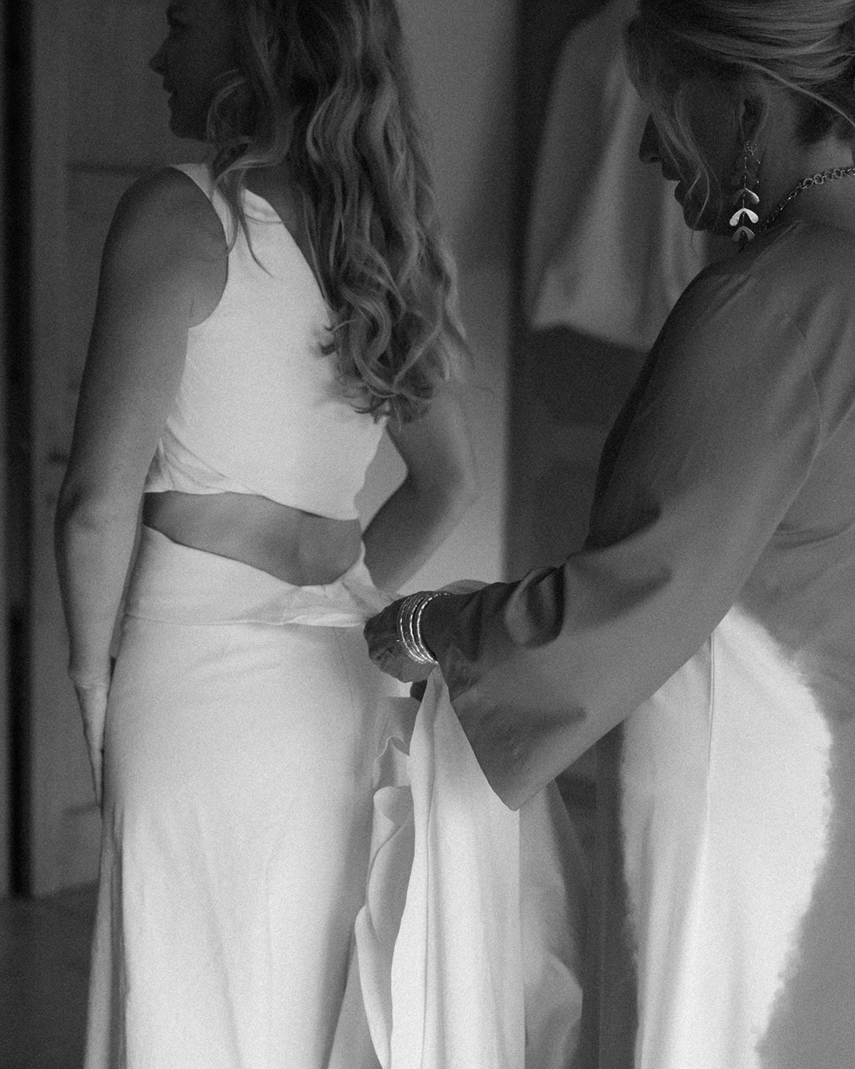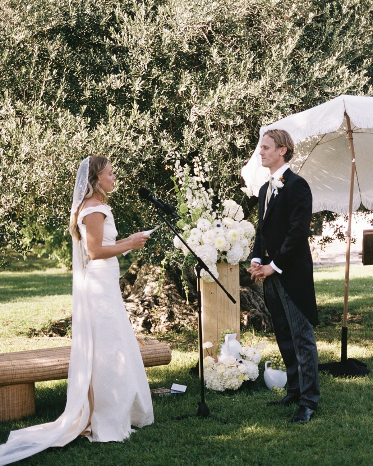 For Friday night’s Toast on the Coast, I wore an incredibly cool Jacquemus dress. For the wedding, I wore a beautiful two-piece from the Mallorcan brand Cortana—I knew I wanted a skirt and top I could wear again. My veil was vintage, a 100-year-old piece originally from San Francisco. And because we were in Spain and I really wanted to dance, I wore white satin espadrille wedges.