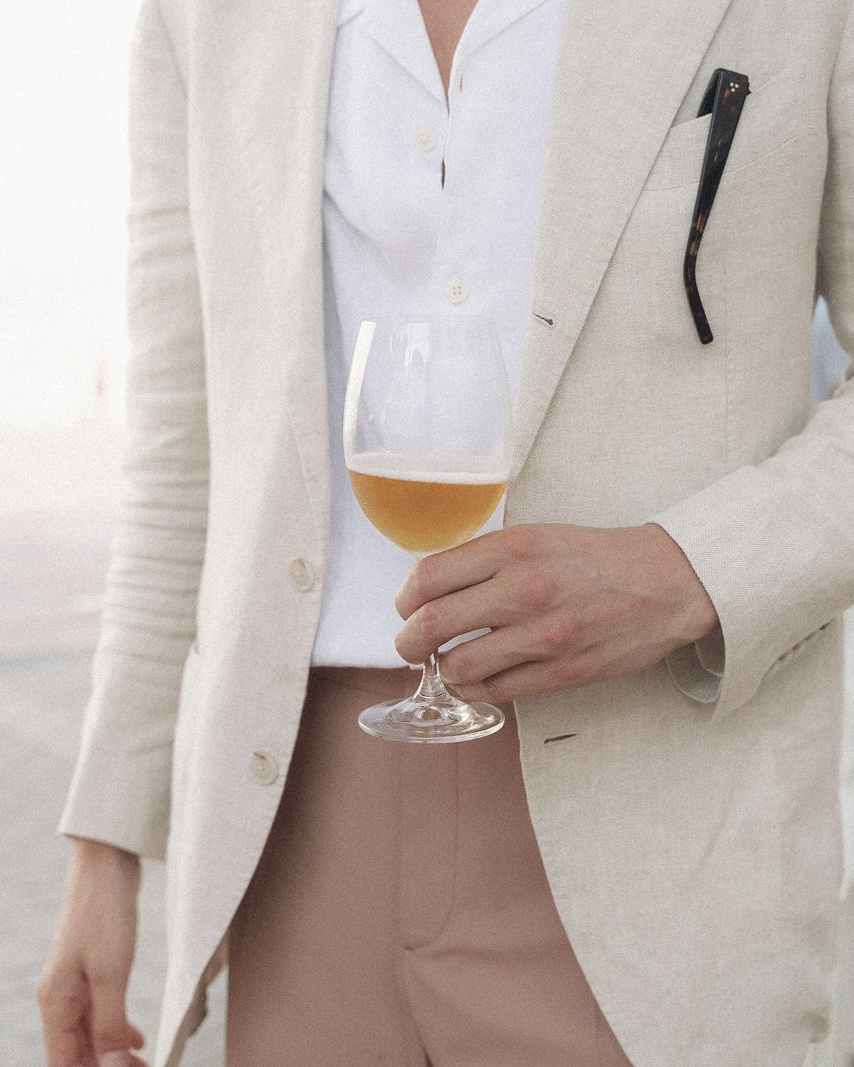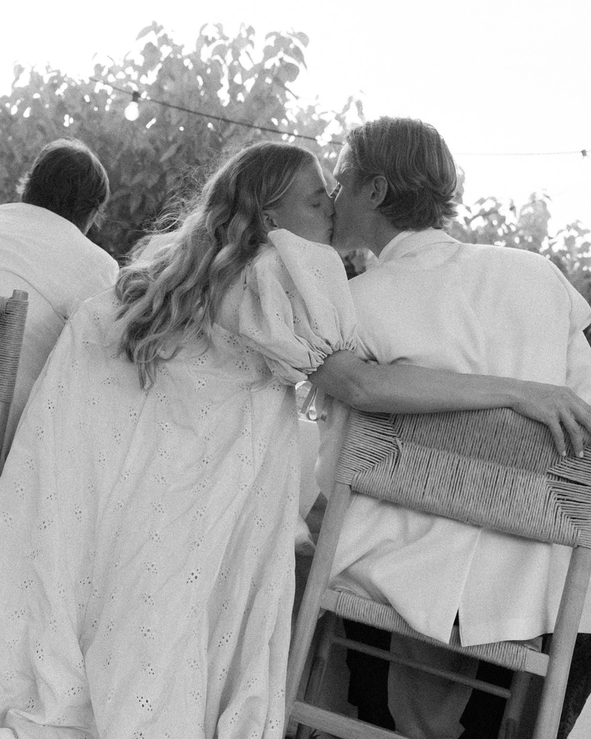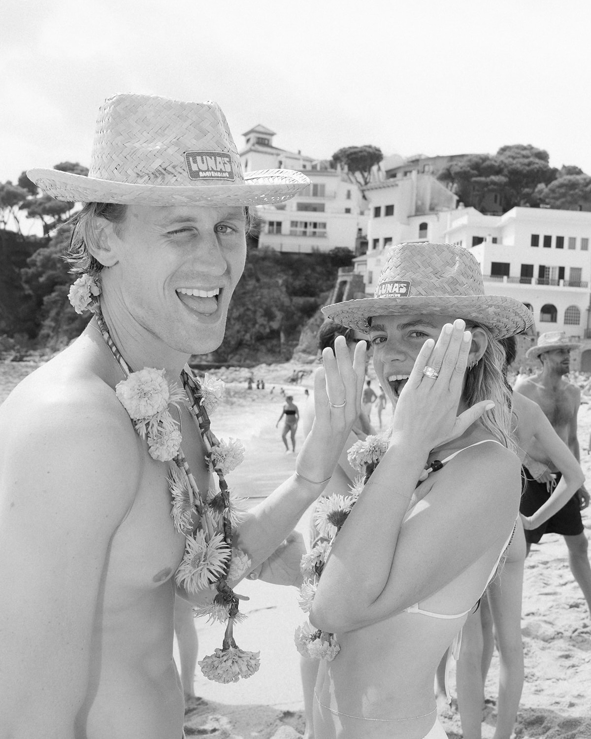 For Friday night’s Toast on the Coast, he wore a crisp white linen shirt and incredible ’70s-inspired flared pants from CMMN SWDN. For the wedding, he wore a morning suit from Pelger for the ceremony and reception, then changed into black tie with a white dinner jacket. His jacket was custom-made by a lovely tailor in the center of Amsterdam called Tommy Page. For the Sunday beach day, he wore casual board shorts and a straw sun hat from—of course—Luna’s Bartending.