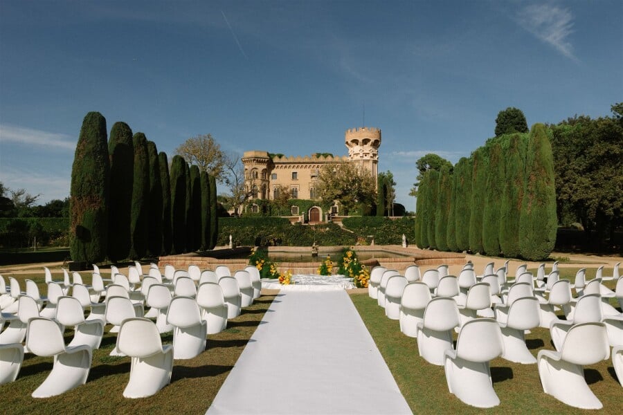 We chose the beautiful city of Barcelona as a meeting point for our guests traveling from around the world—a city we knew everyone would enjoy, rich in art, incredible food, nightlife, and culture. For our wedding day, we envisioned something outdoors, surrounded by nature, where we could enjoy the beautiful October weather. When I discovered Castell de Sant Marçal, I knew it was the perfect setting for all the ideas I was planning.