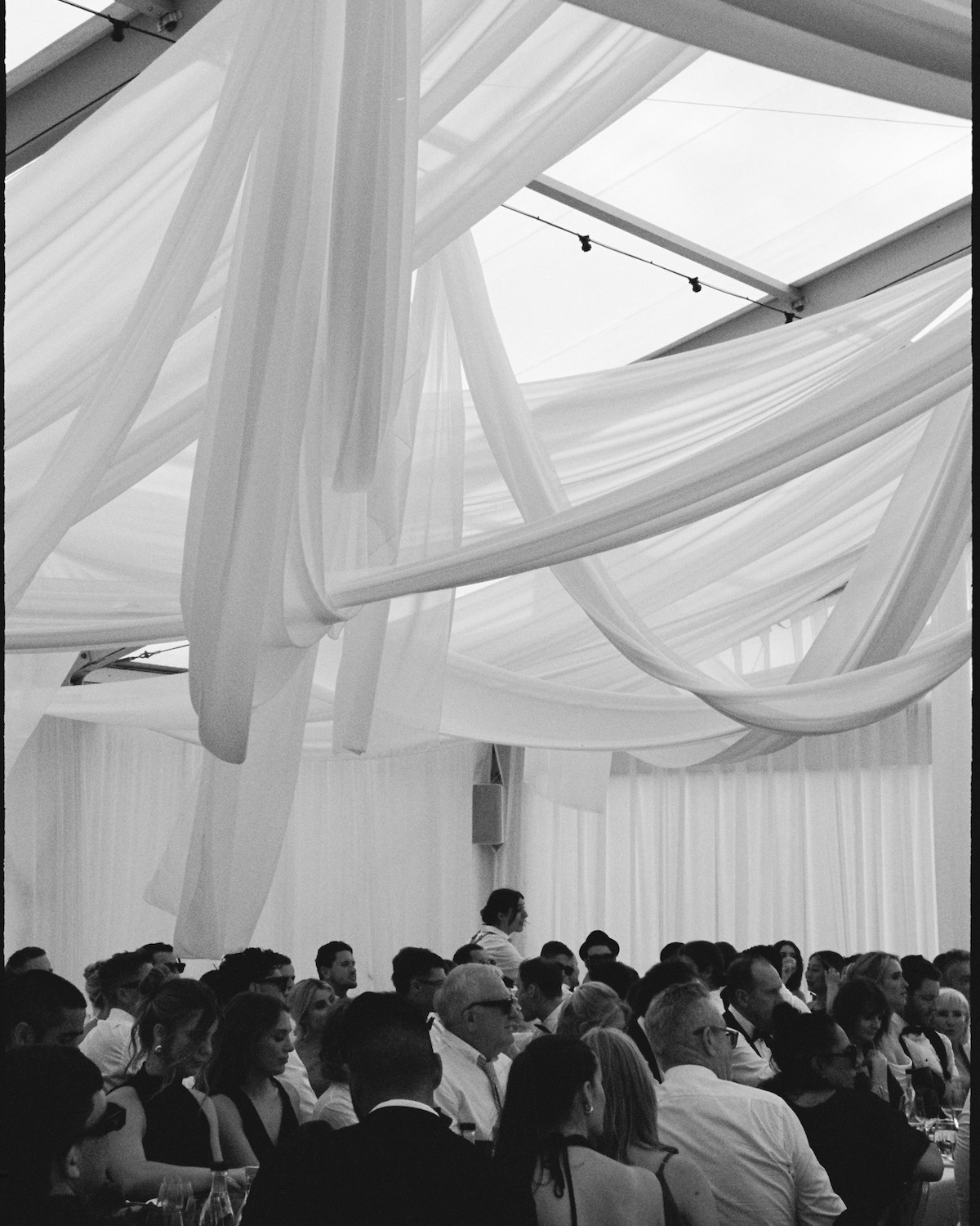 We wanted this to be all about the fun—short and sweet speeches, dinner courses timed tightly so we could hit the dance floor as soon as possible. Since we aren’t huge fans of traditional marquees, we worked closely with Make Haus to transform the space using draping and other design elements. Our goal was to create an ethereal atmosphere that blended seamlessly between indoors and out. We also had a bit of fun with our seating chart, using guests’ nicknames on the place cards, which everyone loved.