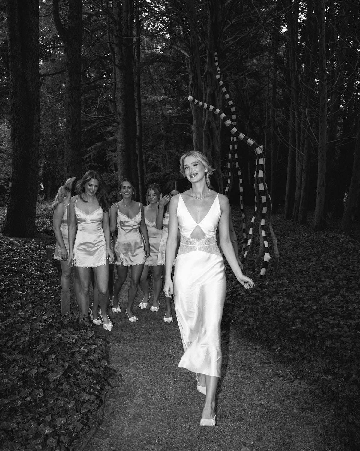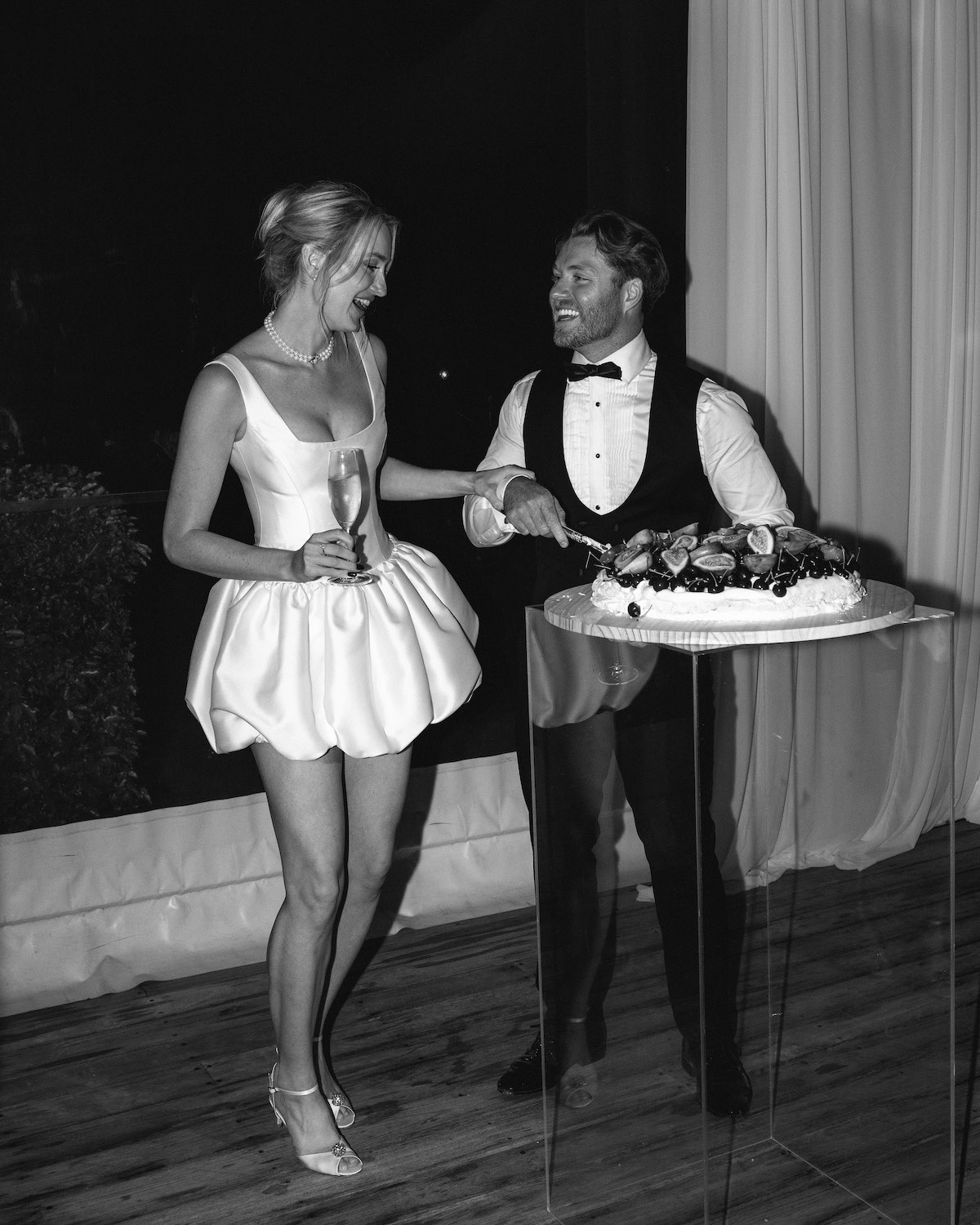 I knew I wanted my ceremony dress to be classic and timeless—something I would still love in 30 years. The Corston gown I chose was actually the first dress I tried on. When you know, you know. I paired it with a tennis necklace my dad gifted me for our wedding and Gucci shoes that added a bit of fun to the look. For my reception look, I wanted to have a bit more fun. I knew I wanted a mini dress with a drop waist. Working with Rhonda from Rhonda Hemmingway Couture was such a fun experience—she is truly an expert in her craft. Creating something bespoke with her was an absolute dream, and I’ll forever be grateful for how perfectly she brought my vision to life. I paired it with a Vivienne Westwood pearl choker, Jimmy Choos, and dark red nails, which I thought was a fun way to mix old-world and modern styles.