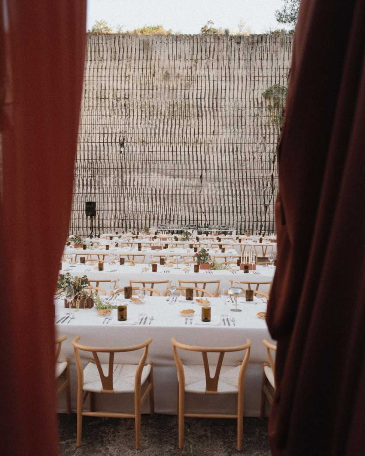 Rather than defaulting to a uniform floor plan, think about how mixing table shapes can create smaller worlds within the larger space. Varying rounds, banquets, and more intimate setups allows the room to be thoughtfully zoned by mood and energy. “A quiet cozy corner for grandparents, a high-energy statement stretch for the bridal party, a tucked-in table for new moms,” explains Honey + Thyme. “The goal is to make dinner feel personal, textured, and spatially intentional, almost like designing small rooms within a larger home.”