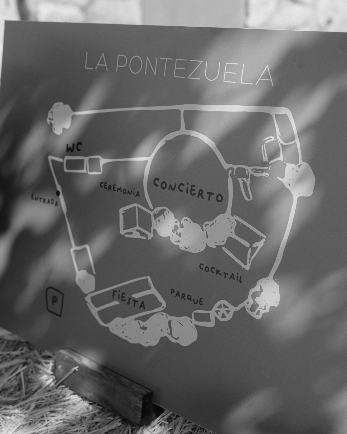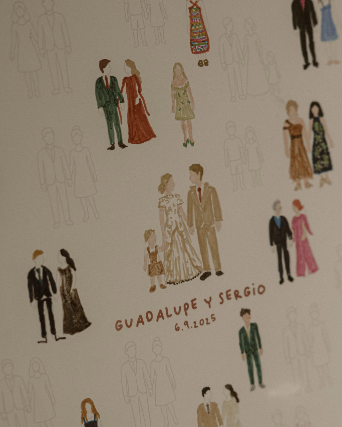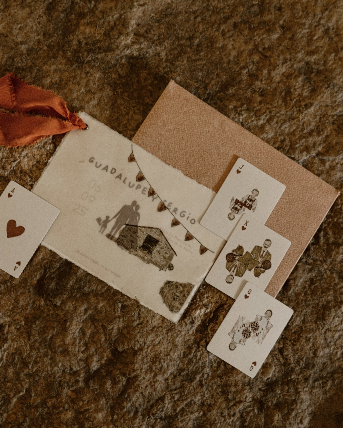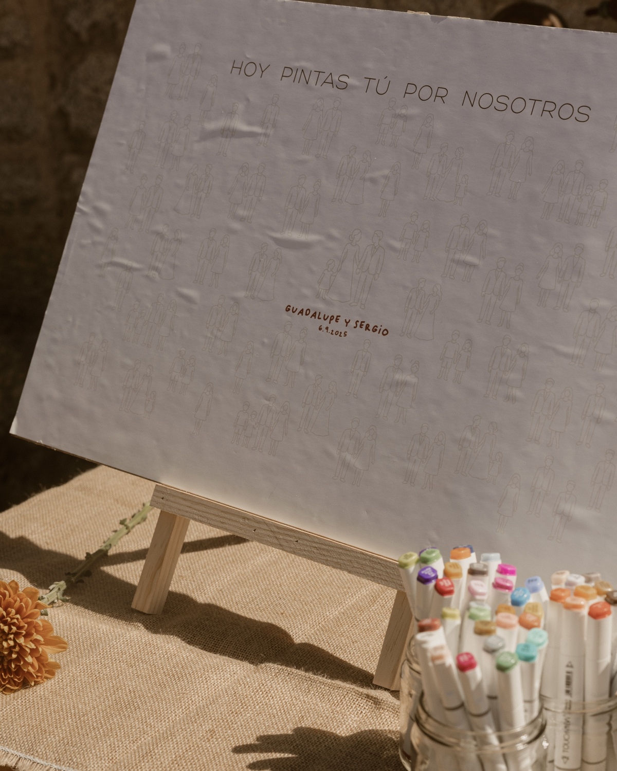 The venue itself was decoration enough, so we decided not to add many flowers or extras. A few days before, we picked up some copper-colored dry branches that we found in the field and loved, and we placed them everywhere. Since I wasn’t going to work as a live illustrator that day, we made a poster with silhouettes that said “today you draw for us,” and people drew their outfits with markers. As a gift, I designed poker decks. We wanted a useful but lasting and meaningful gift, so after thinking about it a lot, we decided it would be a nice way to give something creative yet practical. I drew Sergio (in a suit I made up, because I didn’t see his until that day) as the king of the deck, myself as the queen, and our son as the jack. Then we put all the decks on a shelf with the guests’ names on them so they could take theirs.
