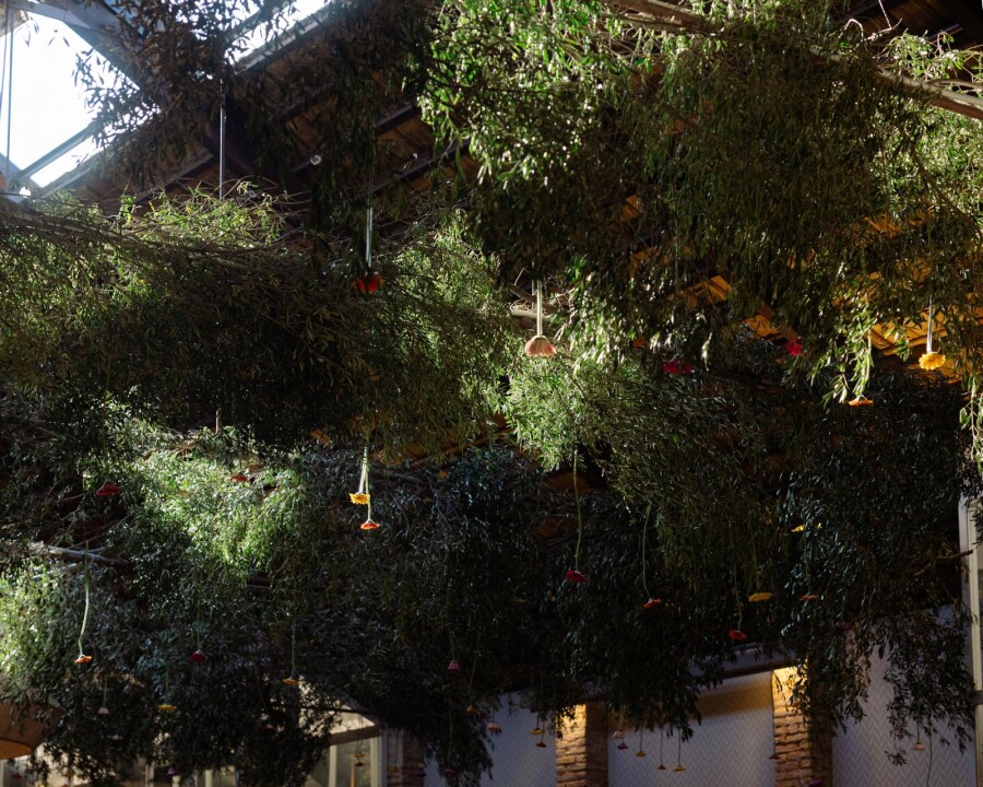 I wanted something unique and original for the reception, so I asked the florist to transform the hall at Campo Aníbal. They covered the entire ceiling with lush, leafy branches and hung colorful gerberas at varying heights, creating a magical and vibrant atmosphere.