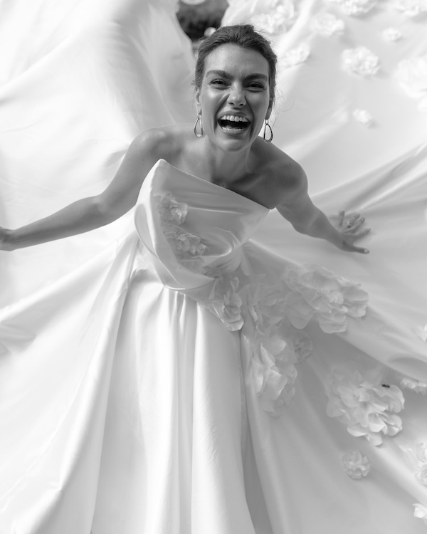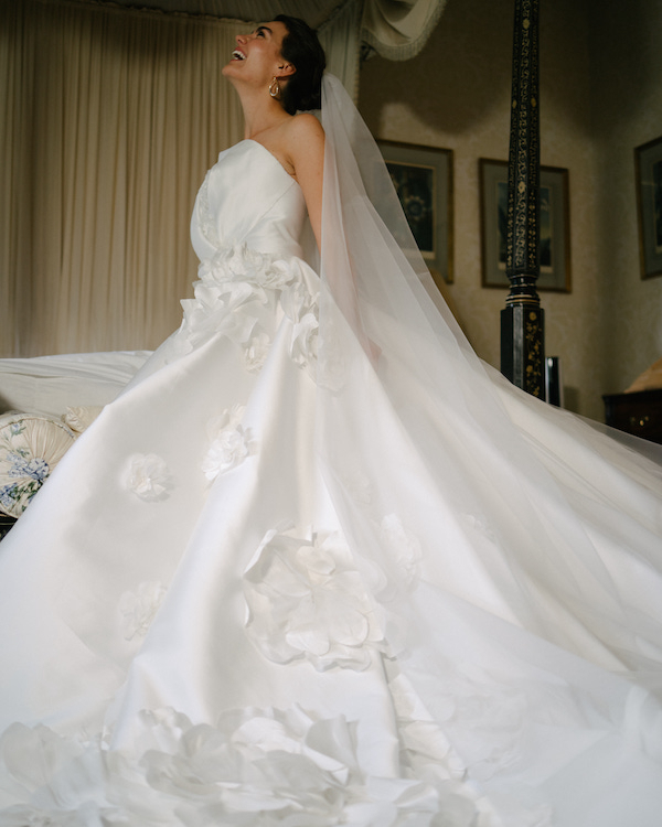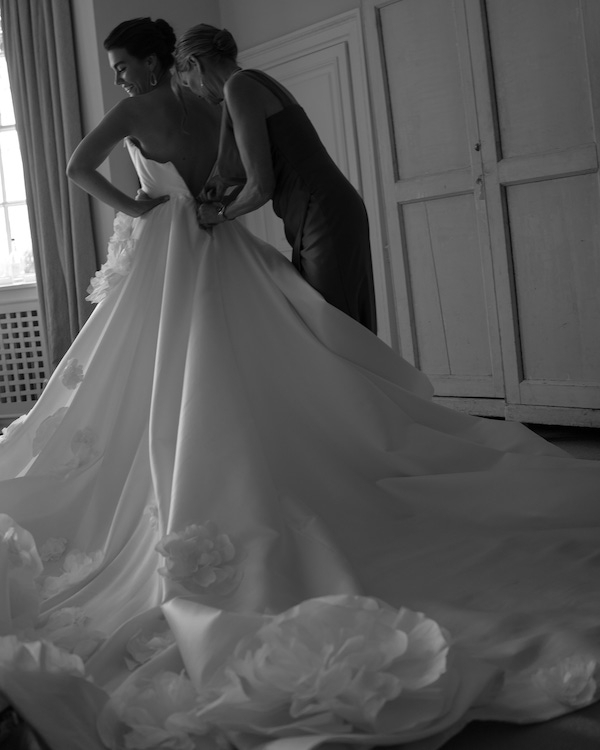 For the wedding, I wore a custom-made couture gown that I designed in collaboration with Edwin Oudshoorn in the Netherlands, as I wanted a connection to my mother’s Dutch heritage. The idea was to create a floral-focused gown, as we envisioned an English garden wedding. I wanted the dress to have an edge while still feeling timeless and unique. Since I spend a lot of time at food and flower markets for my work, the concept was that the dress began at the décolleté as a paper-wrapped flower bouquet, which unraveled into the larger gown, with the flowers spilling out of the paper and cascading down onto the train.