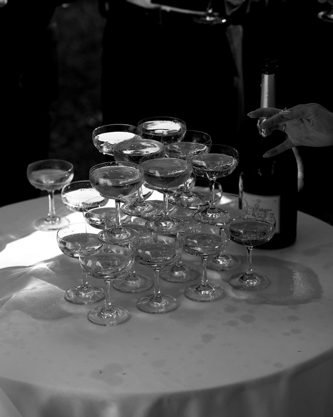 Due to the dynamic weather, our reception took place both inside and outside the estate, which created a fun flow of movement between guests. We had a jazzy bossa nova band with vocals playing in the background, a champagne tower poured with Deutz Blanc de Blanc champagne from the year we met, and various food stations with rotating canapés. Throughout the reception, there were short rain showers, and we saw our guests popping in and out with umbrellas that my parents had provided as a funny surprise, reading "The Chadwyss Wetting" – another personal and humorous touch in the chic setting.