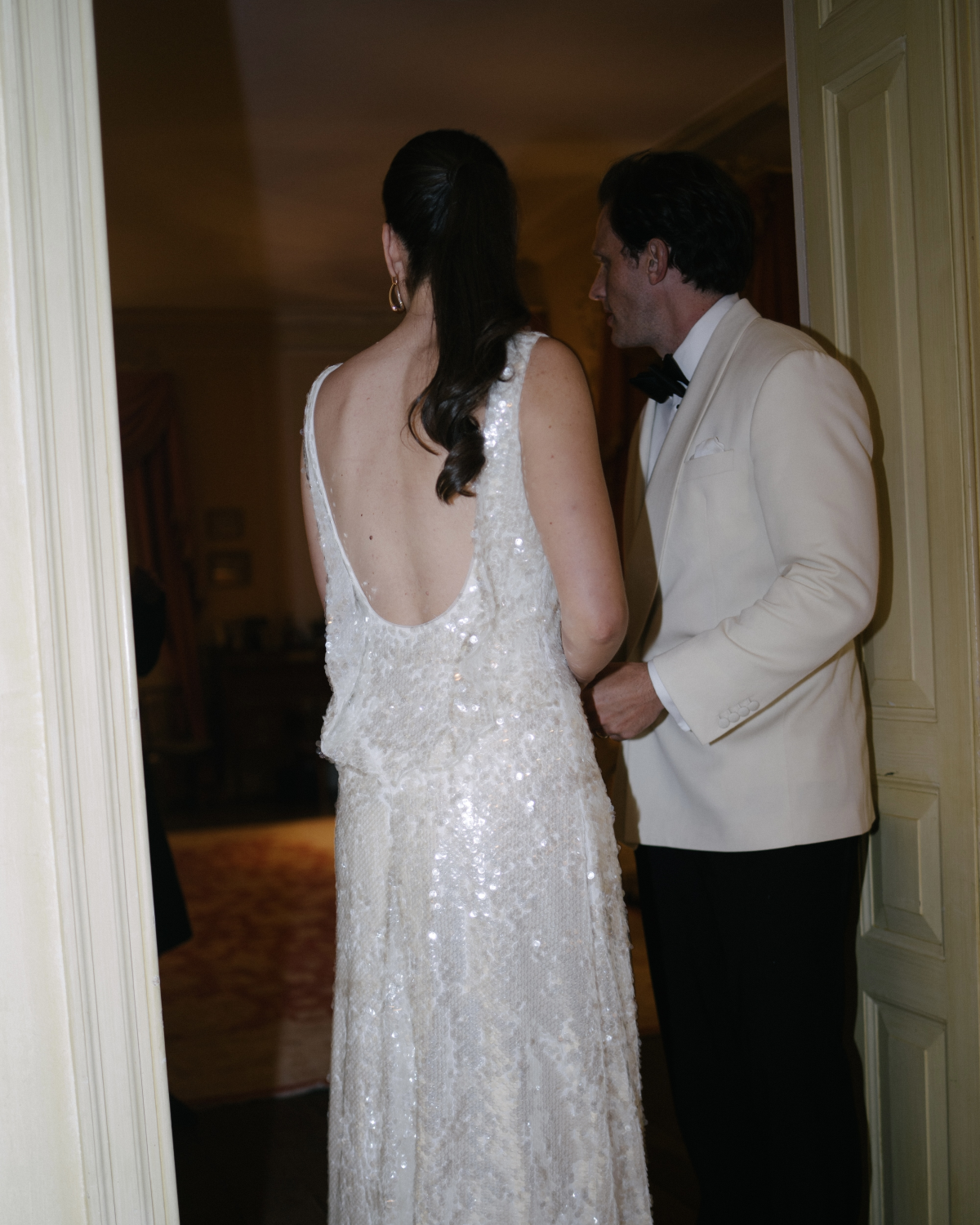 Not gonna lie, it was an intense process, as it took five trips to Holland, but it gave me the opportunity to visit my Dutch side of the family and made the lead-up to the wedding very family-oriented. We paired the dress with classic satin white Aquazurra heels, which were surprisingly comfortable, and my mother’s Pommellato earrings. Inside the dress, my mother sewed in a horseshoe-shaped pin that she wore on her own wedding dress in 1986 for good luck. For the second wedding look, I chose a shimmering sequin dress with an open back by Emilia Wickstead, paired with transparent Amina Muaddi heels.