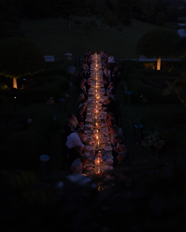 We surprised our bridal party and parents with a beautifully set dinner table in the middle of a field, complete with custom tableware from my brand, Dinier. We began the evening by welcoming everyone at the Manor House with a glass of champagne and advised them to wear comfortable shoes for walking, while still dressing in cocktail attire. Once everyone had arrived, we walked together with a roaming band to a vast field where our dinner table awaited.