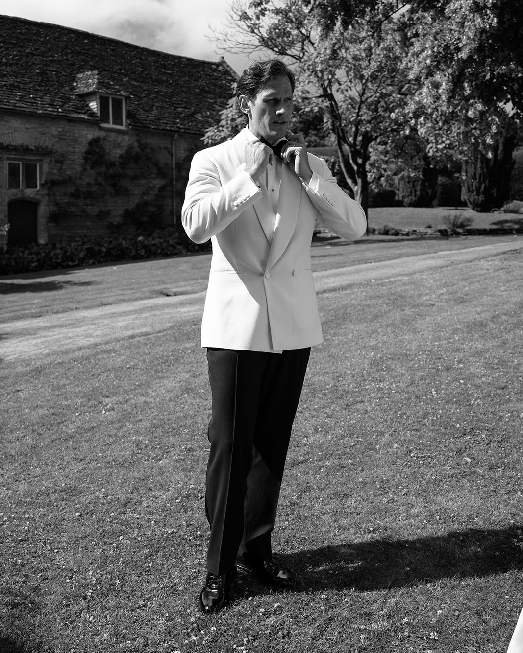 For the wedding day, Miles wore a custom-made tuxedo with black trousers paired with a cream jacket made from Loro Piana fabric, and patent leather derby shoes by Dolce & Gabbana.