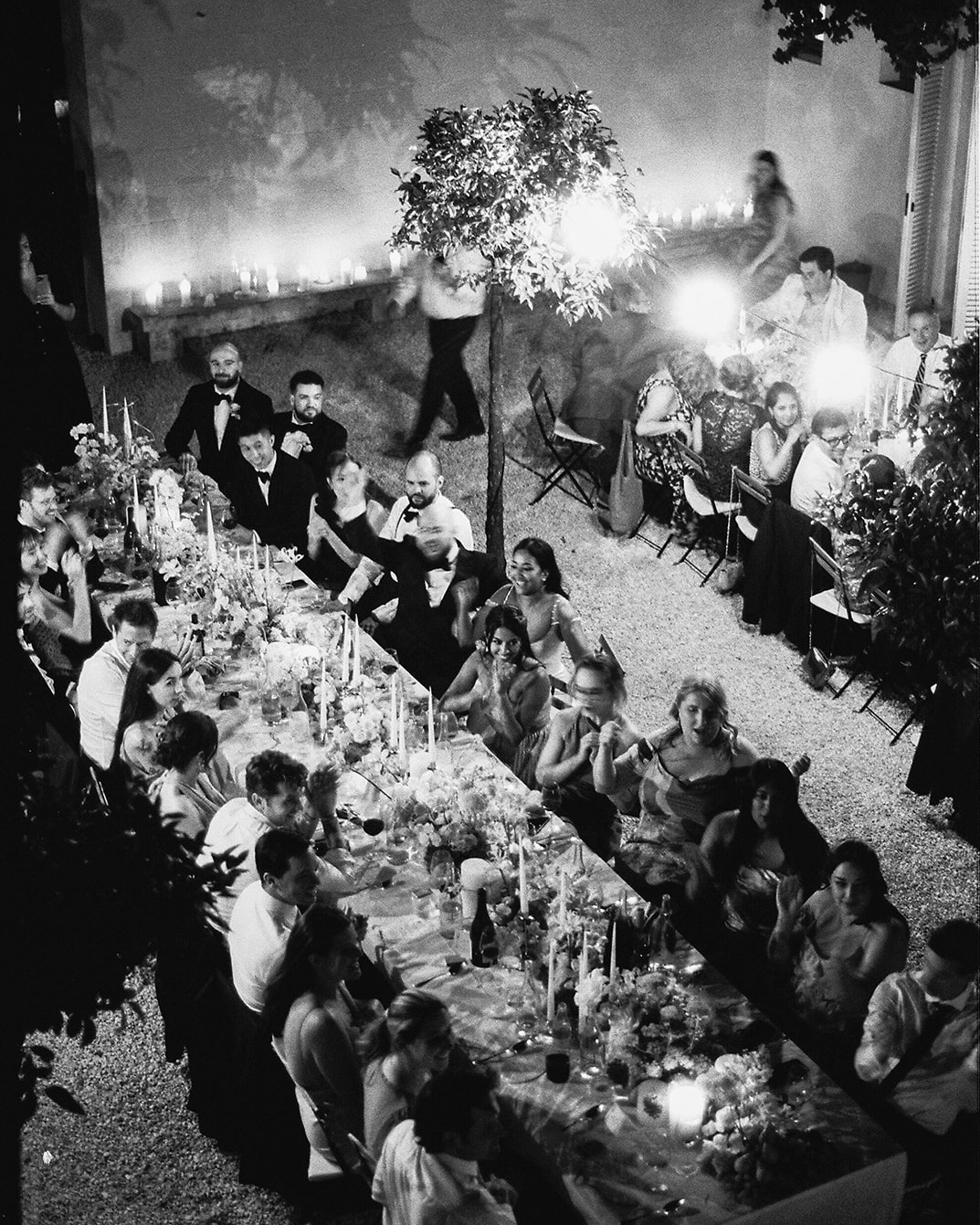 We joined guests for a poolside aperitivo hour following the wedding ceremony. Guests enjoyed spritzes and local delicacies, including a freshly-made mozzarella station, while the string quartet played. Dinner was held in the courtyard of the masseria. We really wanted this to feel like our best dinner party ever, with a focus on delicious food and a beautiful atmosphere. We had long tables filled with romantic flowers interwoven with fruit, candles, and custom splatterware plates made by local ceramicists.