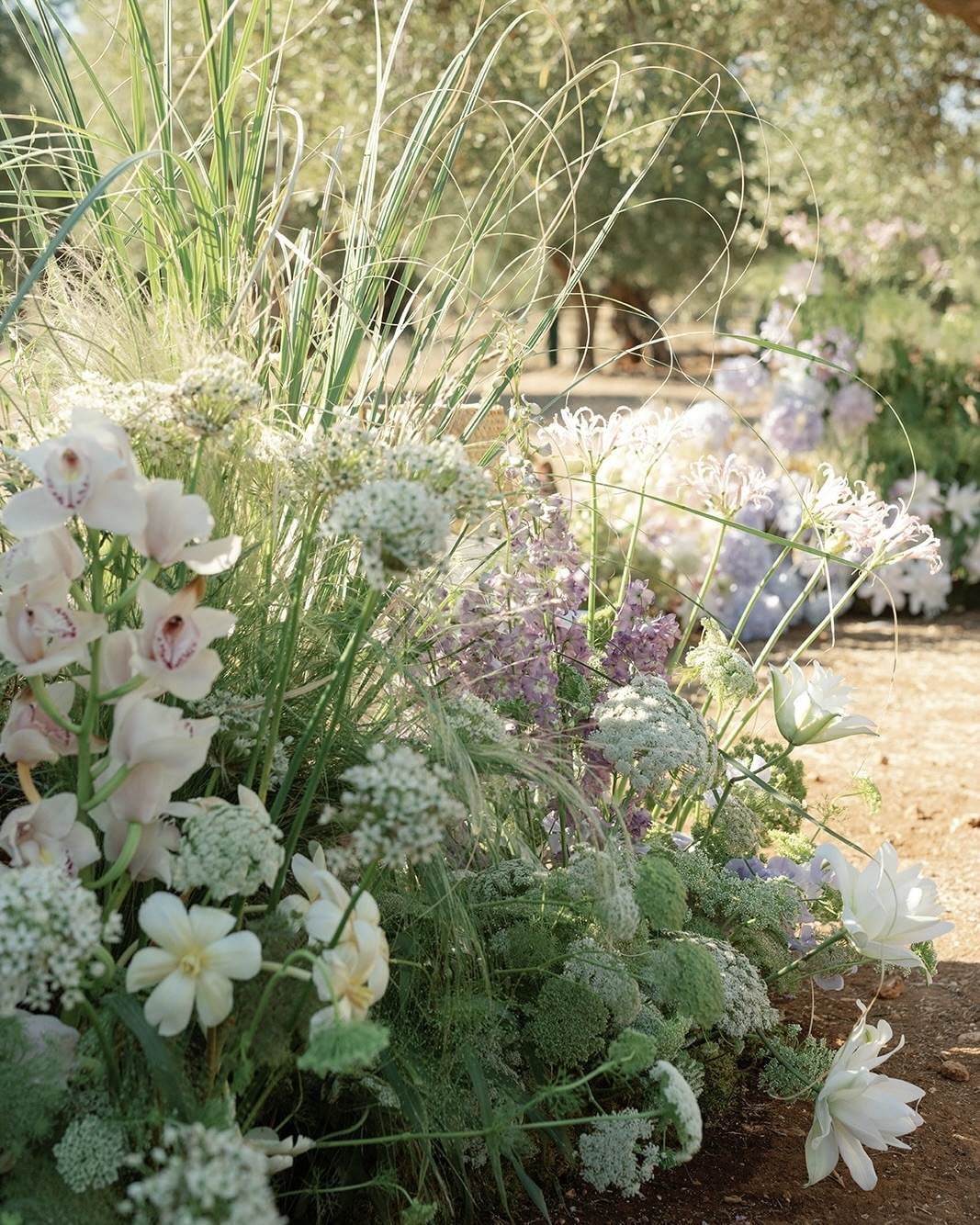 In the heart of Puglia, amidst rolling hills and olive groves, Babi and Ian's wedding was a symphony of love and celebration, blending cultures, traditions and an unmistakable sense of joy. The celebration began with a traditional Hindu ceremony in a whitewashed courtyard, its simplicity beautifully contrasted by an explosion of bold, colorful flowers. The second ceremony took place in the dappled sunlight of an olive grove – a true fairytale setting. Whimsical floral altar installations, crafted with a touch of artistry, rose from the earth like something enchanted, framing the couple as they spoke their vows. Babi was a vision in her bespoke CINQ mermaid-style gown, every detail a blend of sophistication and ethereal charm. The couple's wedding was not just an event, but an experience – a tapestry of romance and playfulness, where tradition met whimsy.