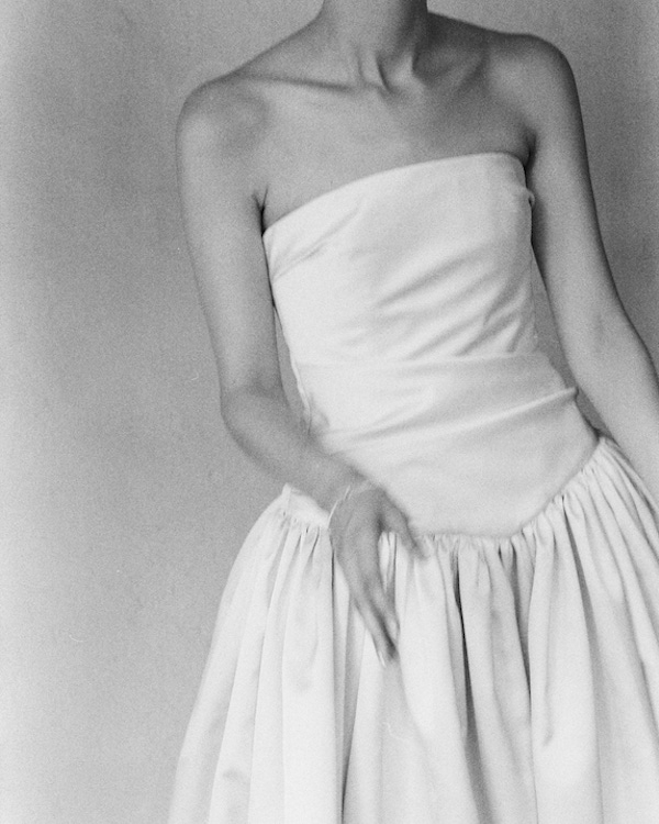 We decided on shoes and jewelry after we finalized the dress and went with vintage Manolo Blahniks for the ceremony and Jil Sander sandals for the party. We love Alexis Bittar, so we chose their Pansy Petite Earrings as they’re delicate and beautiful for the ceremony look and a pair of their Solamales Crystal Double Drop earrings. For the party dress, I wanted a simple slip dress and something slightly sparkly, so we found a fabric that is a little translucent and sparkly in the light.