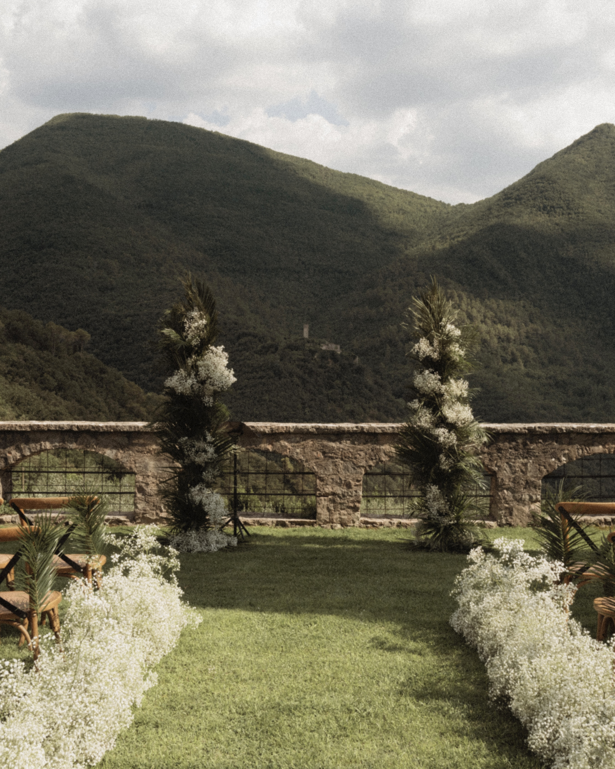 We wanted something not too big and not too flashy but that was beautiful and very "us," celebrating such a special moment with our family and friends. I wanted to bring a little bit of my California vibe into it, as that's where I grew up, so that's why we had the palm leaves involved. Also, I’m obsessed with candles, so I wanted to try and use them as the main decorations on the table. Also, we’re country kind of people (even though I was brought up in the city), and the venue scenery just captured what we really wanted. The area is so beautiful—there’s a lot of nature involved, and it just really called out to us. We love Umbria, the region, too. We didn’t have to do much as the venue and scenery spoke for itself. We wanted that to shine most importantly and have it speak for itself.