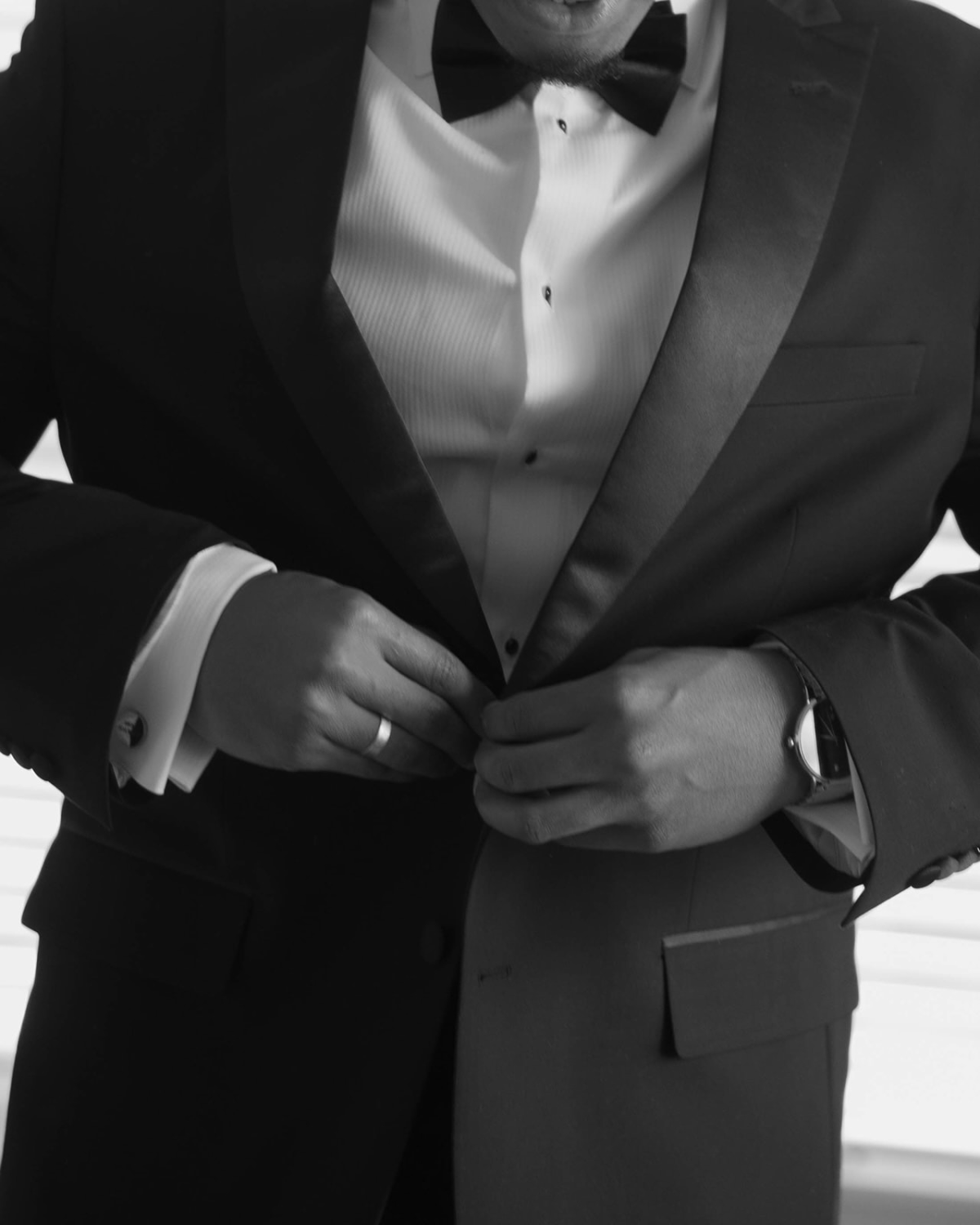 Kyrell’s tuxedo was a complete surprise to me — I let him choose whatever he wanted. He went with a classic tuxedo featuring a cummerbund, boutonniere, and bow tie, giving total James Bond energy. He paired it with his gold watch and the custom cufflinks I gave him that morning, engraved with a little drawing of us — a small detail that made his look feel even more special.