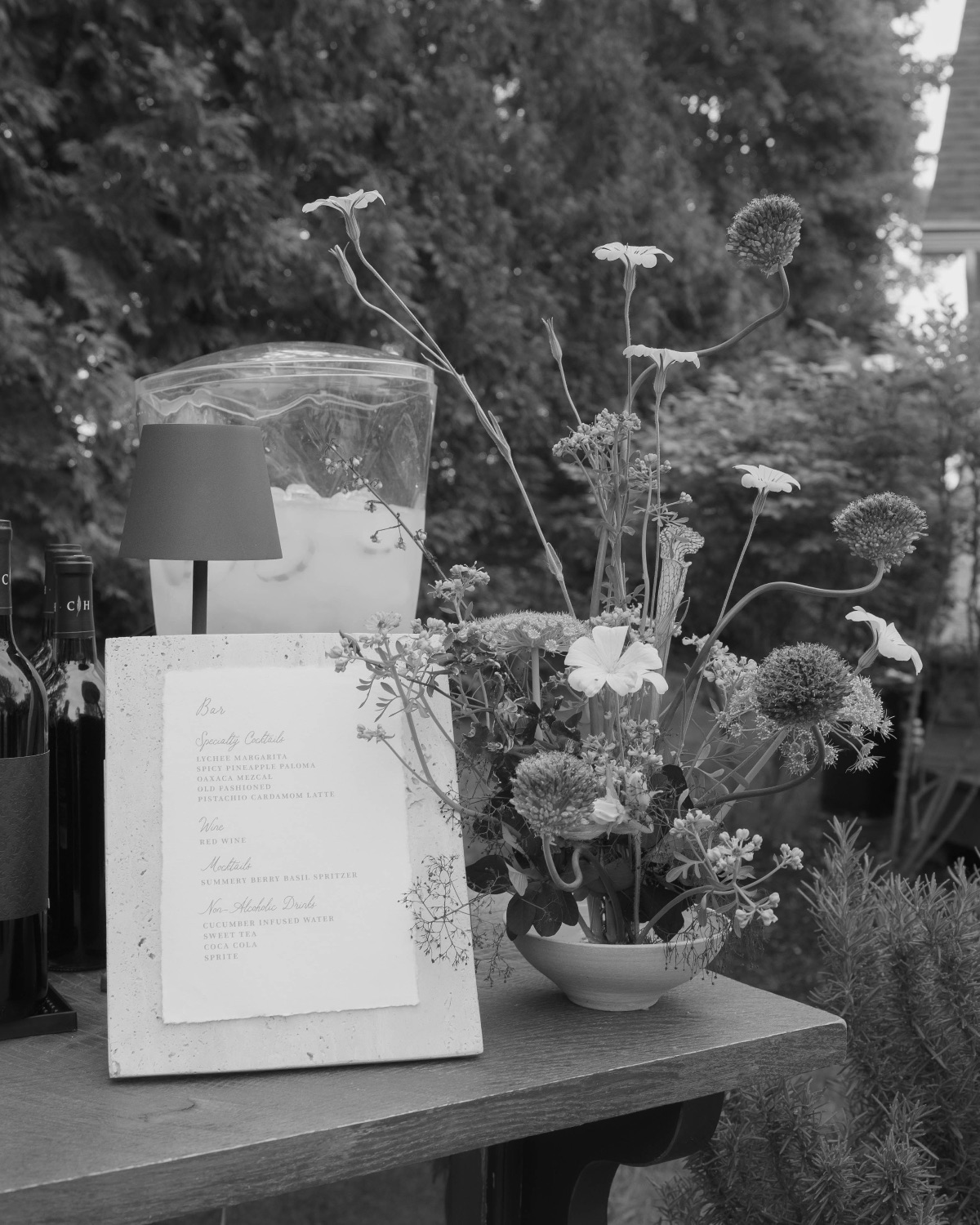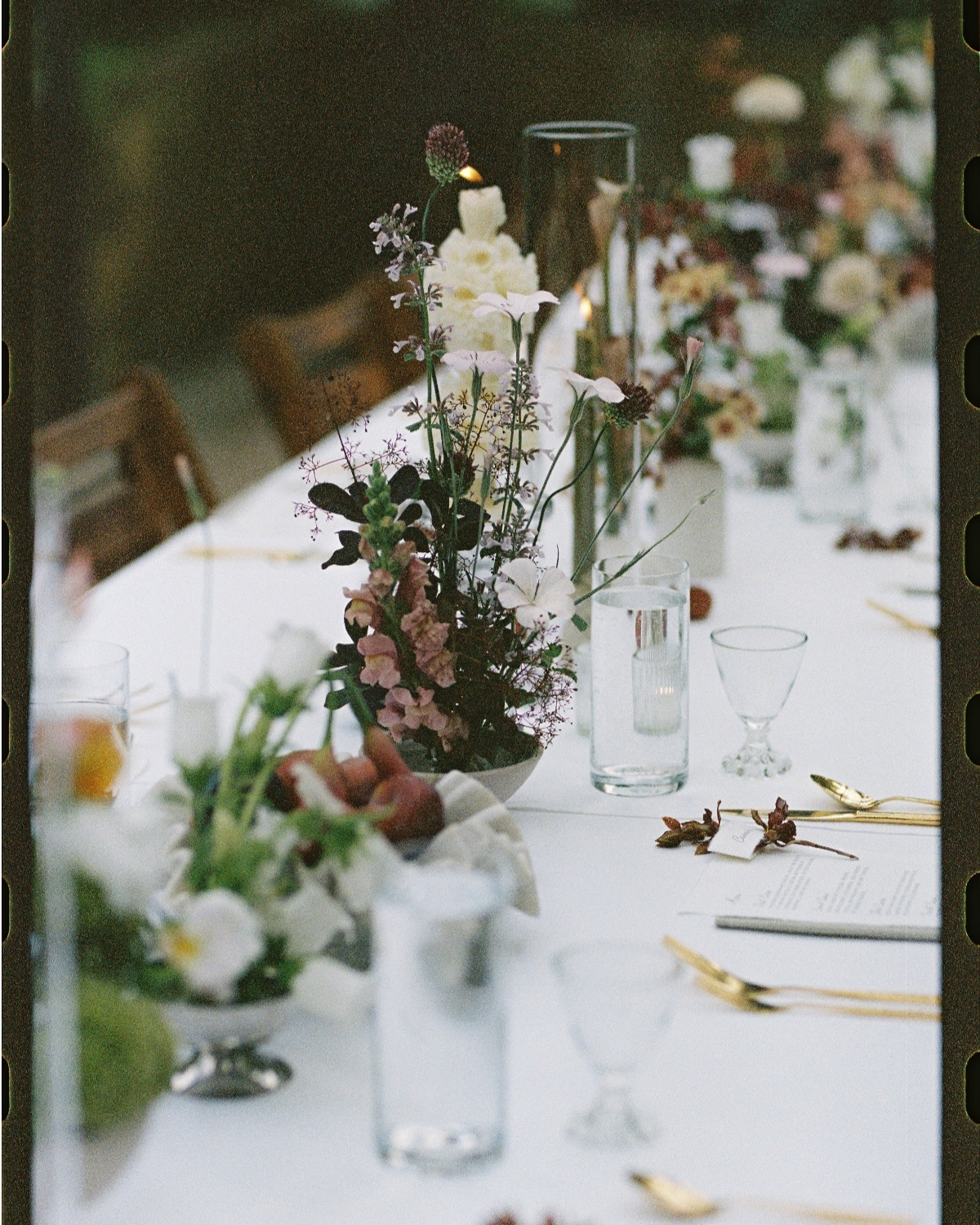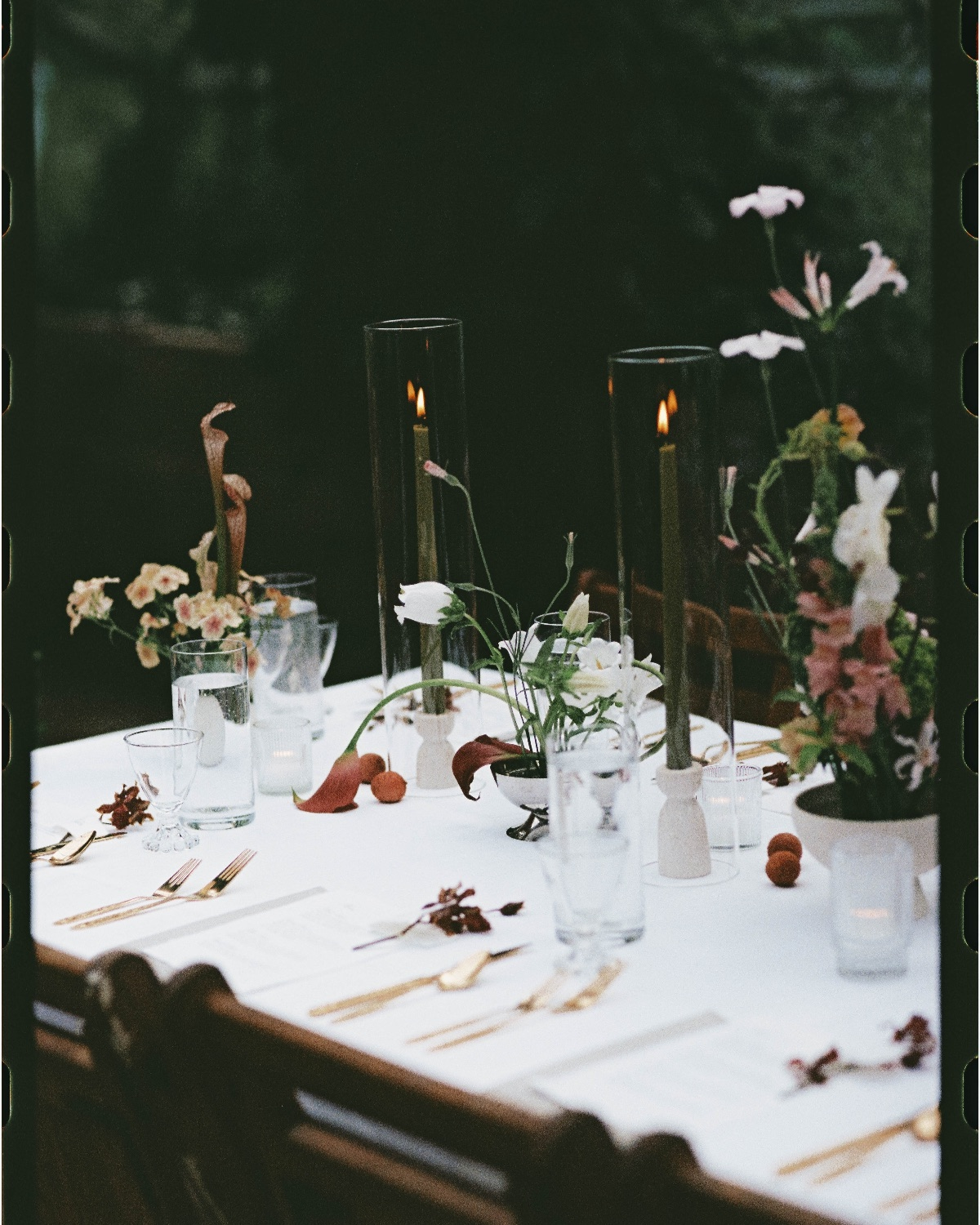 Our vision for the wedding was an elegant garden dinner party — an intimate celebration in the state where we met, surrounded by just 14 of our dearest immediate family members. We wanted it to feel like a garden party where flowers seemed to grow straight from the ground and the atmosphere felt warm, joyful, and full of love. We blended that natural charm with an understated elegance, creating a day wrapped in blooms, sunlight, and thoughtful details that felt uniquely ours. Filled with family traditions, incredible food, and the people we cherish most, it was the perfect reflection of us. We wanted to be present and enjoy every moment together, and it naturally unfolded into a lake cabin weekend filled with bonfires, board games, and late-night laughter. To make it even more special, we gave our family a dress code: floor-length gowns in soft yellows, pinks, and greens for the women, and sharp, James Bond–inspired tuxedos for the men — and everyone delivered beautifully.