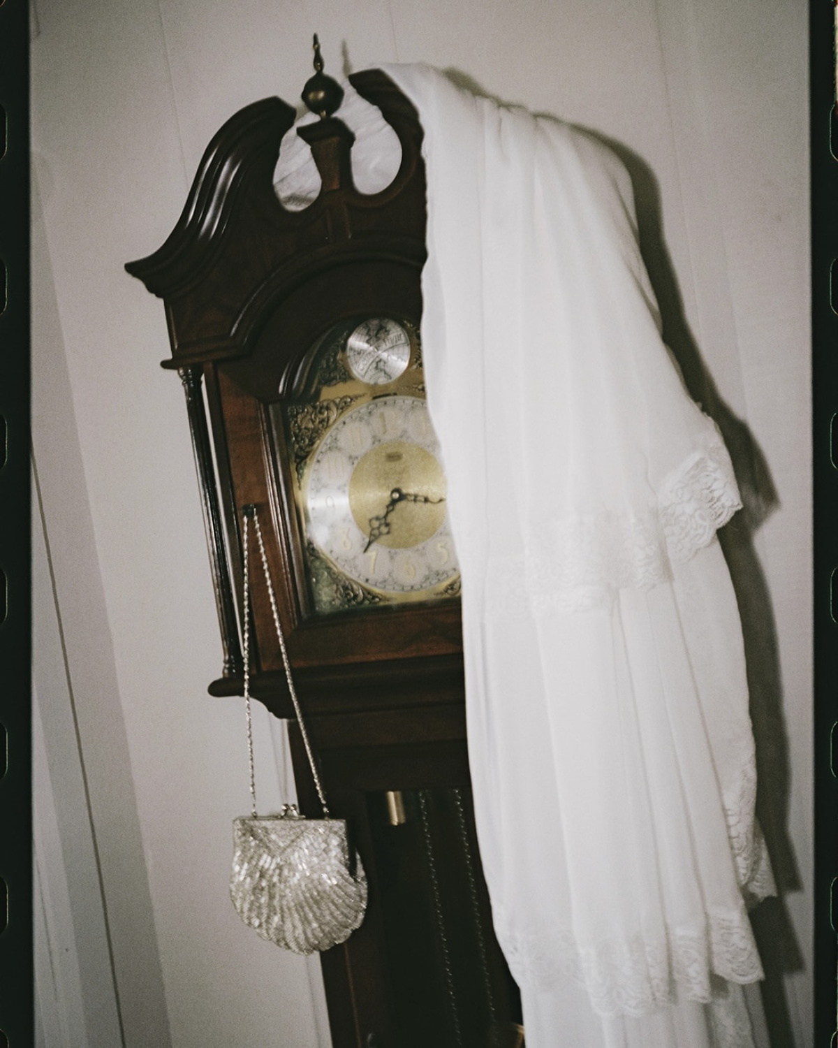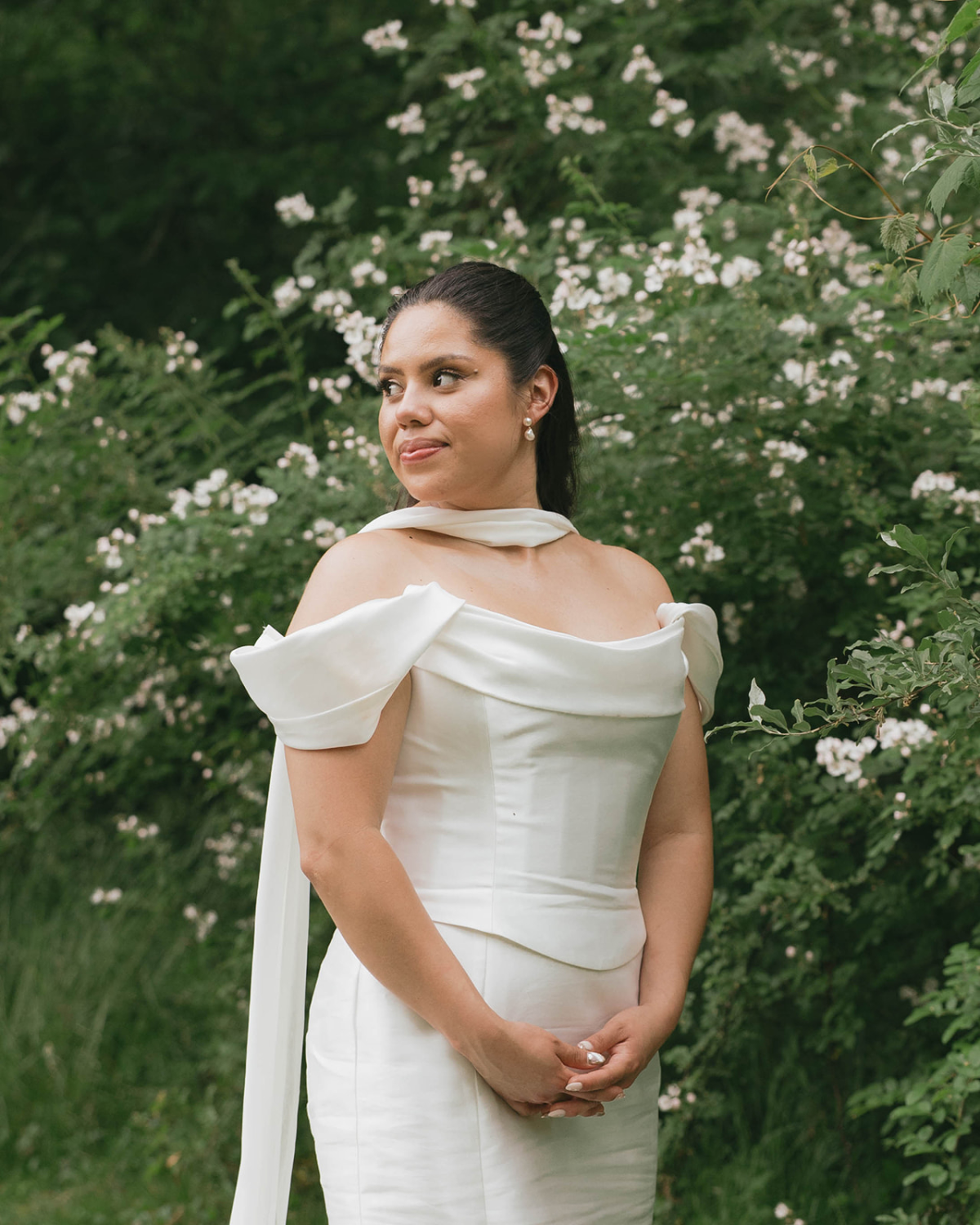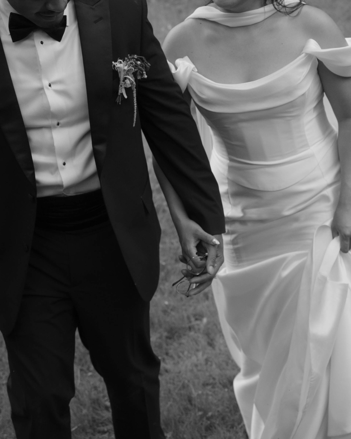 For my wedding look, I wore the Agapé dress by Watters with removable sleeves. I wanted my look to feel timeless, elegant, and comfortable — something that reflected my style without feeling overdone. I really wanted to make the most of wearing my gown since, realistically, you only get to wear it once. For my “second look,” I removed the sleeves and added a handmade neck scarf, giving it a fresh, effortless twist. I paired the dress with pearl drop earrings for a classic touch, Ypres heels from Australia featuring a unique silver heel, a three-tier manta veil, and a vintage silver shell purse — the perfect blend of sophistication and sentiment.