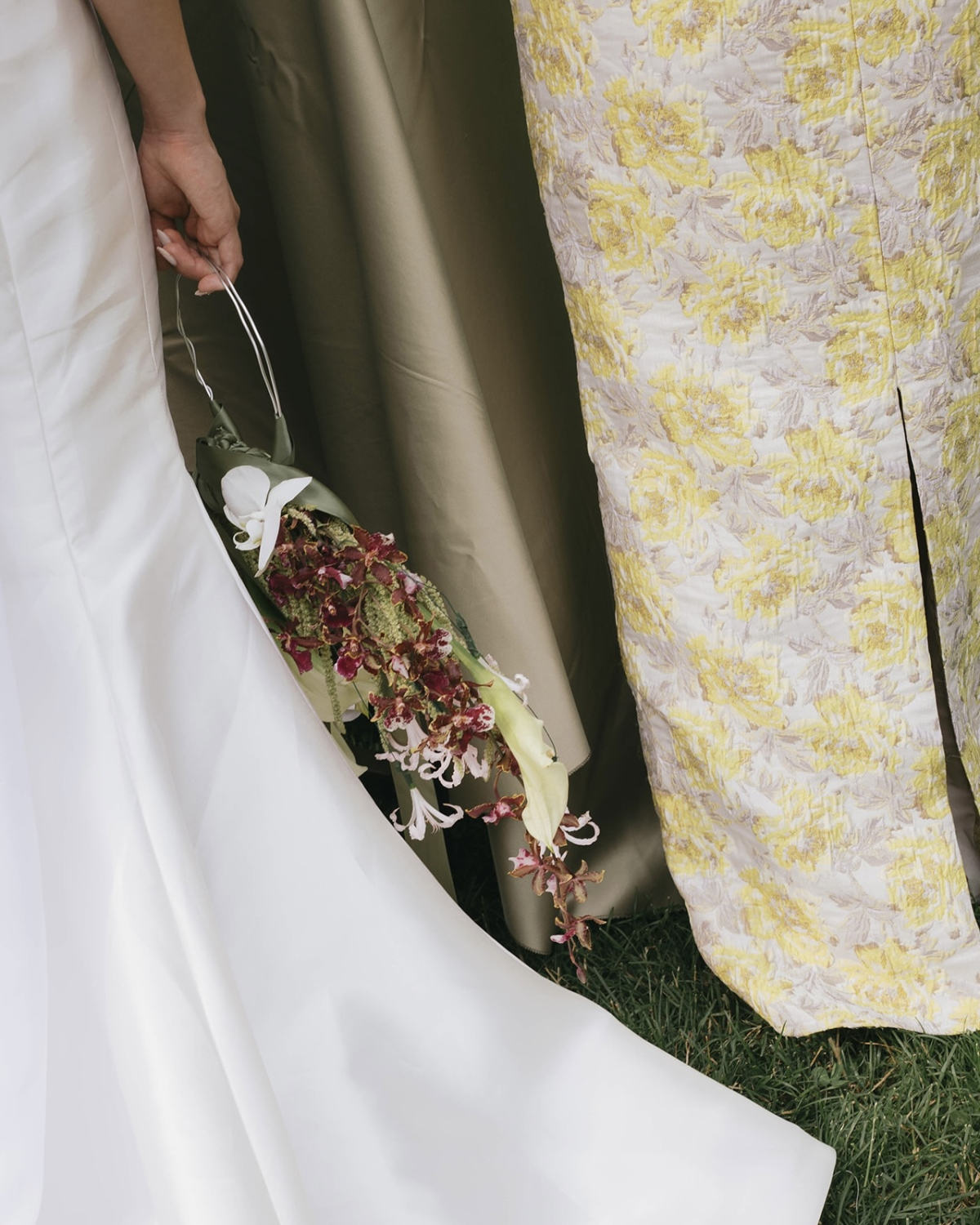 We didn’t have a bridal party, but my sister was my maid of honor. She wore an Alfred Sung strapless yellow metallic jacquard column gown that perfectly complemented the garden setting. The color caught the light beautifully and tied in effortlessly with the soft, whimsical tones of the day, making her look radiant among the blooms. My husband’s brother stood beside him as his best man, also wearing a classic tuxedo. Together, they looked timeless and refined.