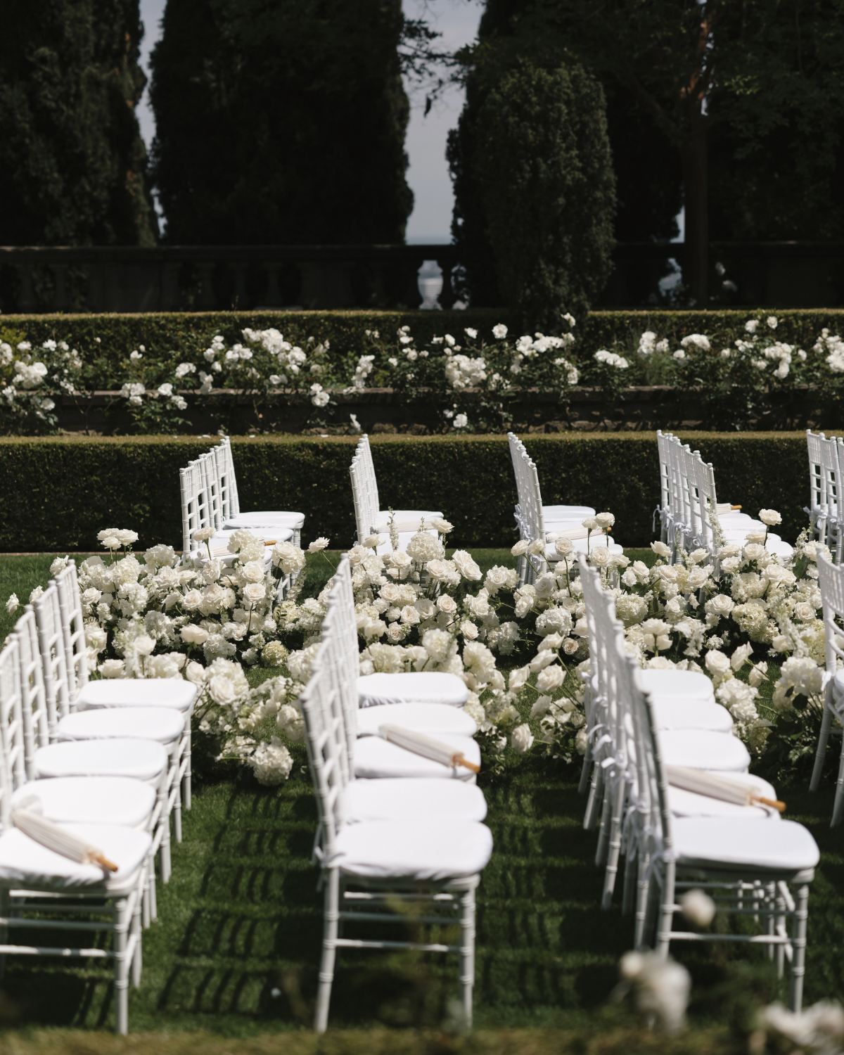 Our ceremony felt like everything was coated in gold sunlight. The aisles were lined in hydrangeas and white roses that created what felt like clouds in a sea of green grass. At the end were pillars of florals with ethereal drapery and a fountain in the center.