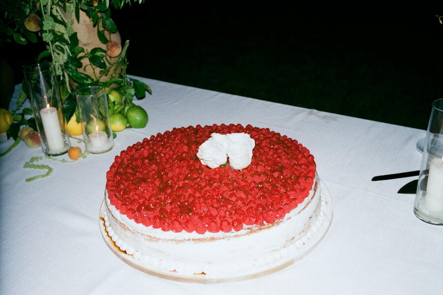 We designed our cocktail hour around a large walnut tree that sat right at the edge of a natural pond on the property. Our bar wrapped the tree on all sides and served our signature drinks: an extra-cold dirty martini, a mezcal margarita and a white negroni. After cocktails, the band welcomed guests over to the reception area, where we danced, shared some of our favorite dishes family style under the stars (like spicy vodka sauce rigatoni and chicken milanese), and danced some more. We cut the cake (an extra large tiramisu covered in raspberries), and I grabbed a glass of champagne and my two friends Lauren and Alex to help lace me up into my second look. Mini espresso martini shooters, affogatos, and french fries were served on the dance floor late night and naturally, we ended up in the pond.