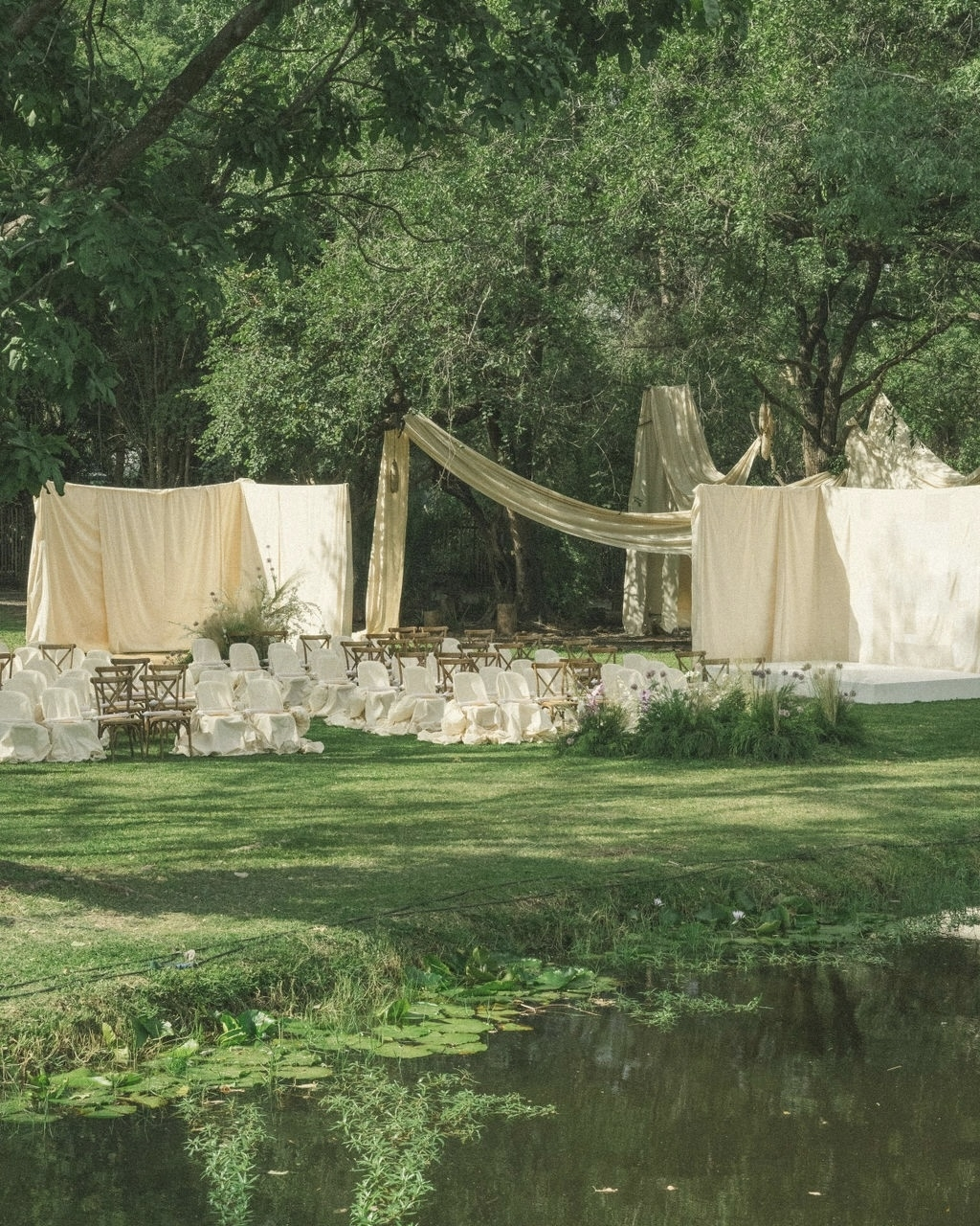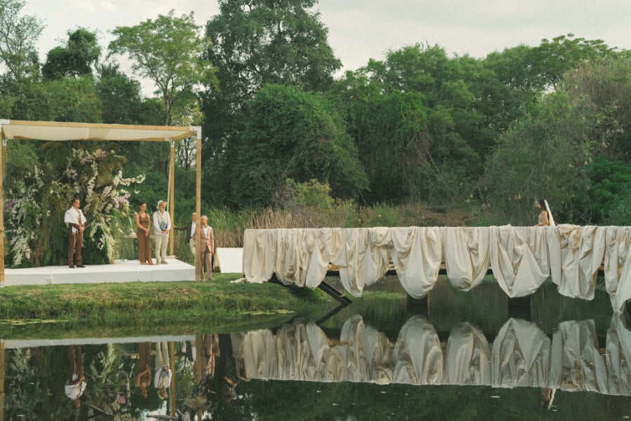 Our ceremony was a dream, set in the Kingfisher Boma at the Royal Livingstone – a spacious yet intimate landscape surrounded by lush greenery and a tranquil pond. Our 3m-high chuppah was built on a grass island surrounded by water. The wedding team draped bridges and trees, and our guests were seated across the island in chairs covered with dramatic bow seat covers. The color theme was a fairly neutral palette, but Heike from Fleur le Cordeur added my preferred pop of color – a little lilac.