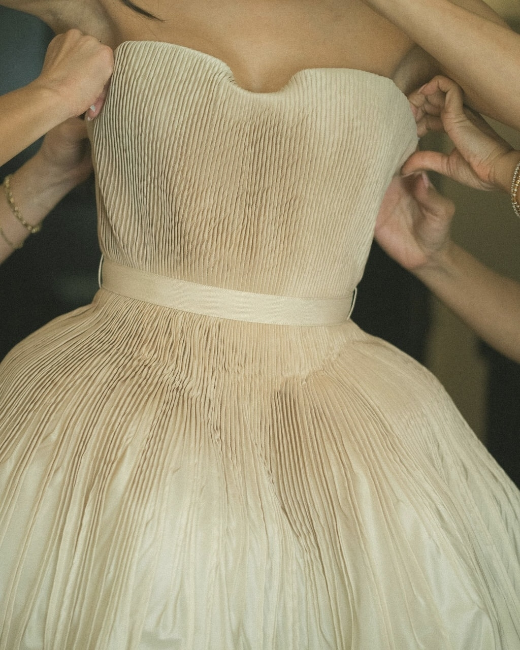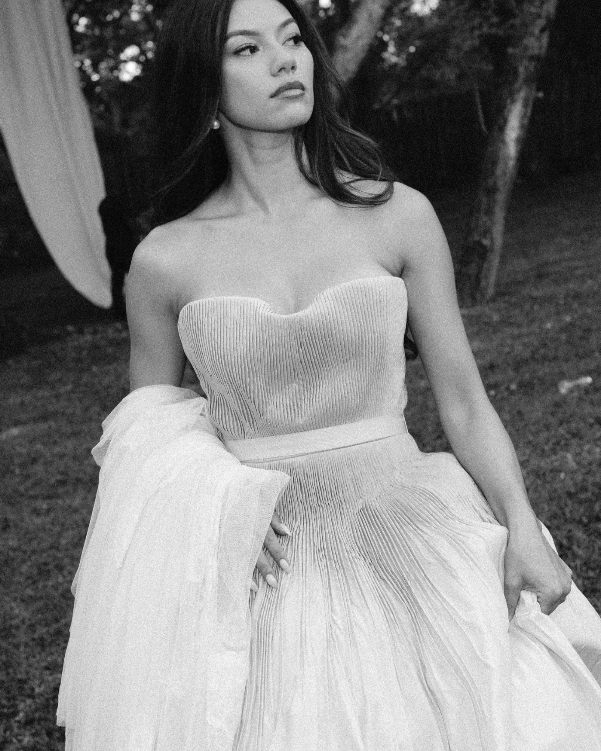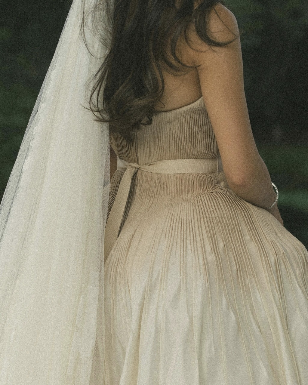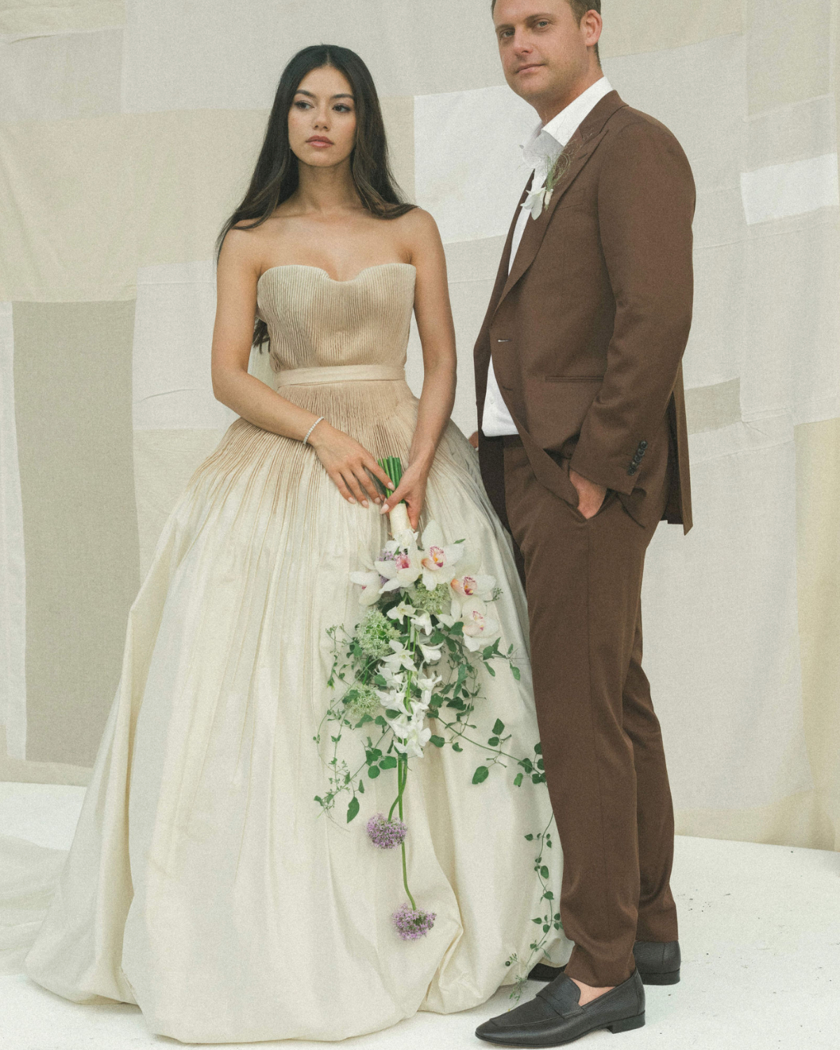 It took me several months to find the one. I tried on countless gowns, met with various designers, and even flew from Sydney to Brisbane to visit Sam at Bloom Australia and explore their collection of Danielle Frankel pieces. I had narrowed it down to a few styles I liked, but it wasn’t until Sam invited me to the Danielle Frankel trunk show in Sydney that I found Lennon – a hand-tucked silk taffeta gown in Almond, featuring a hand-dyed ombré bodice. We made custom adjustments to lower the backline and extend the train. The color was a perfect complement to my olive skin tone, and we paired the gown with a custom extension of the Pleated Malfroy and Lace veil.