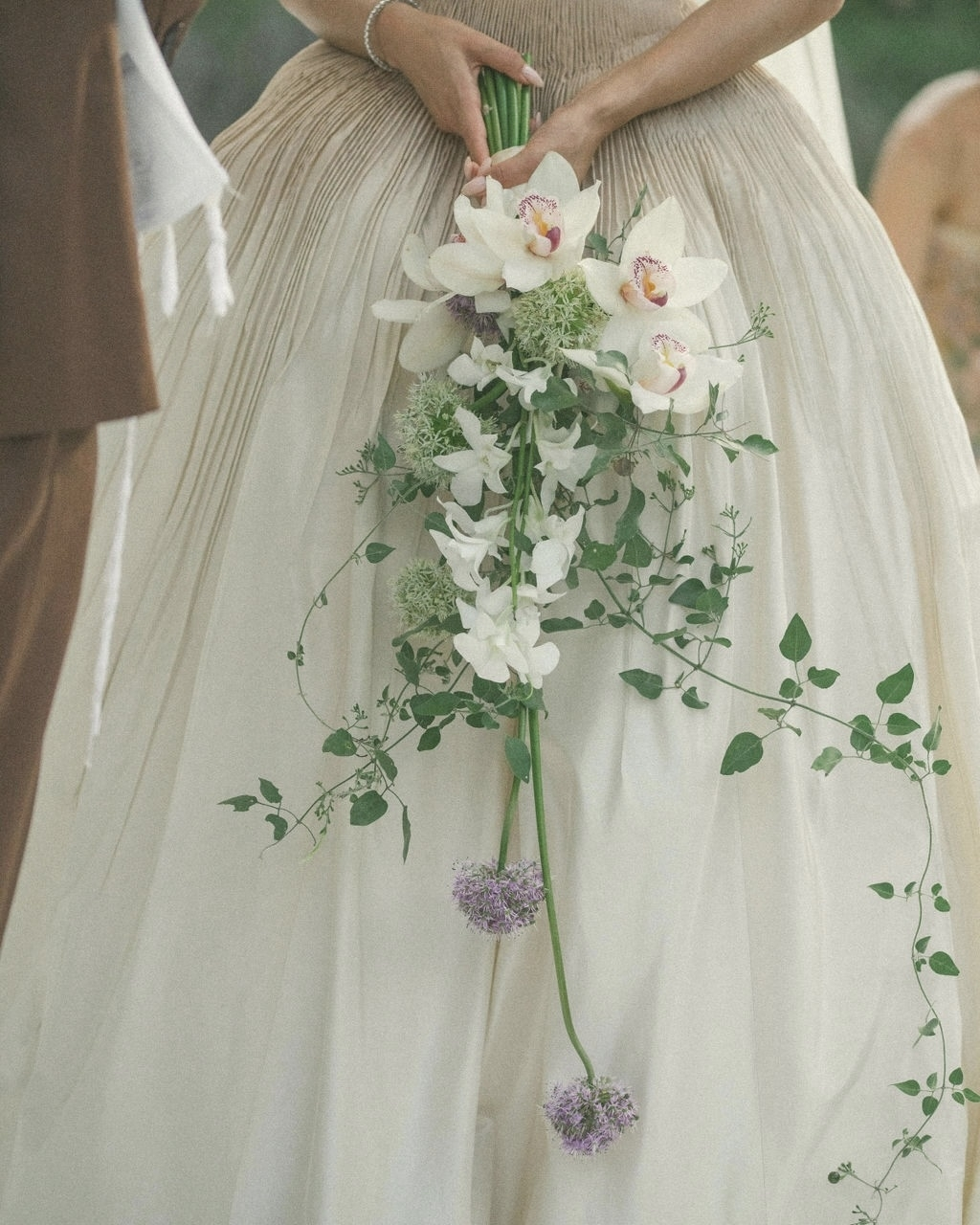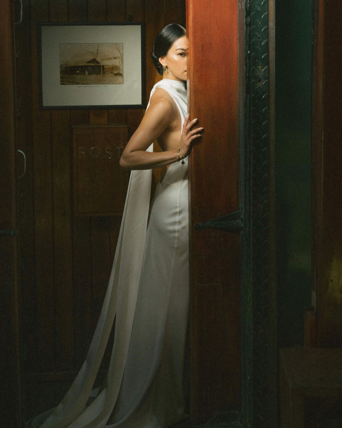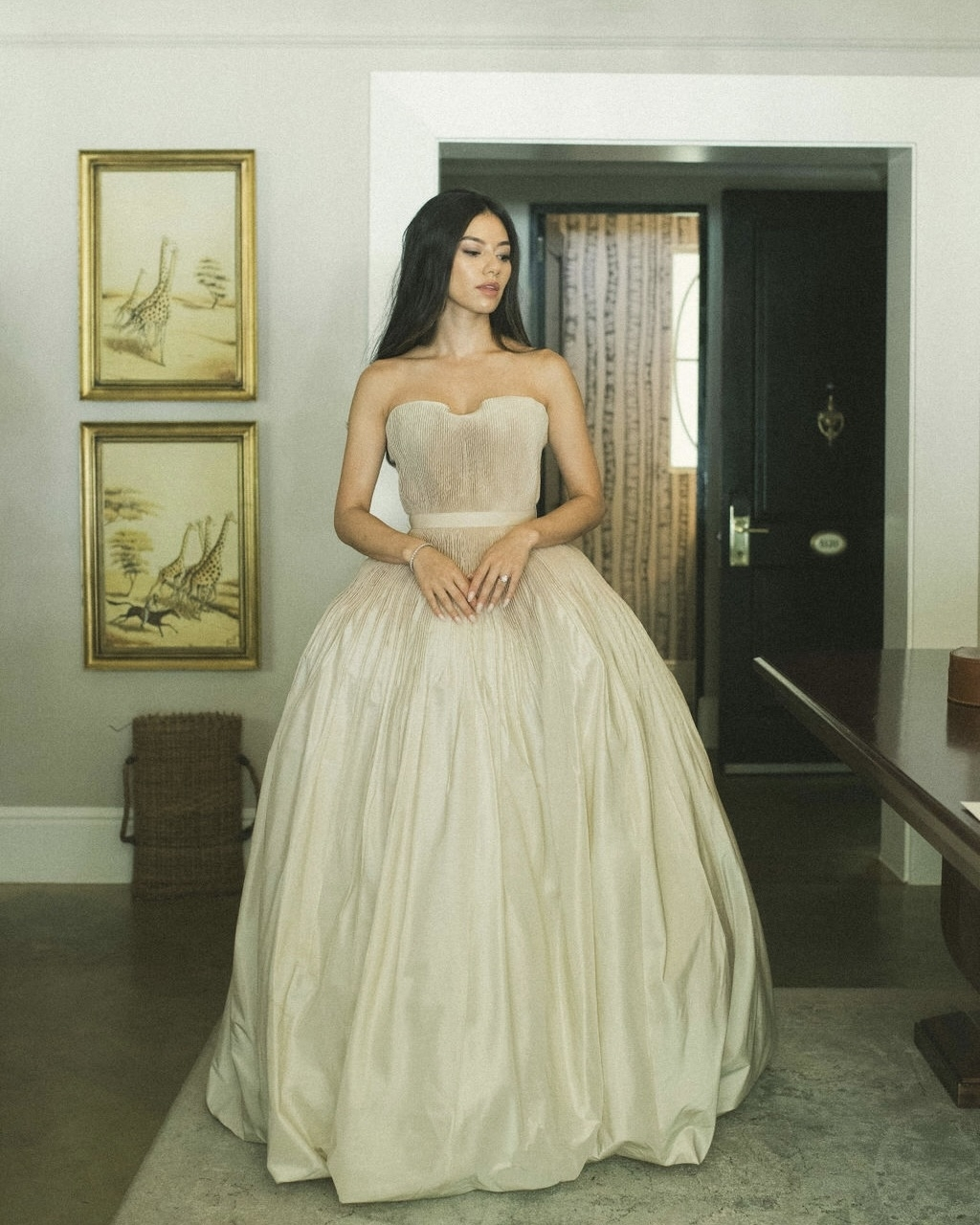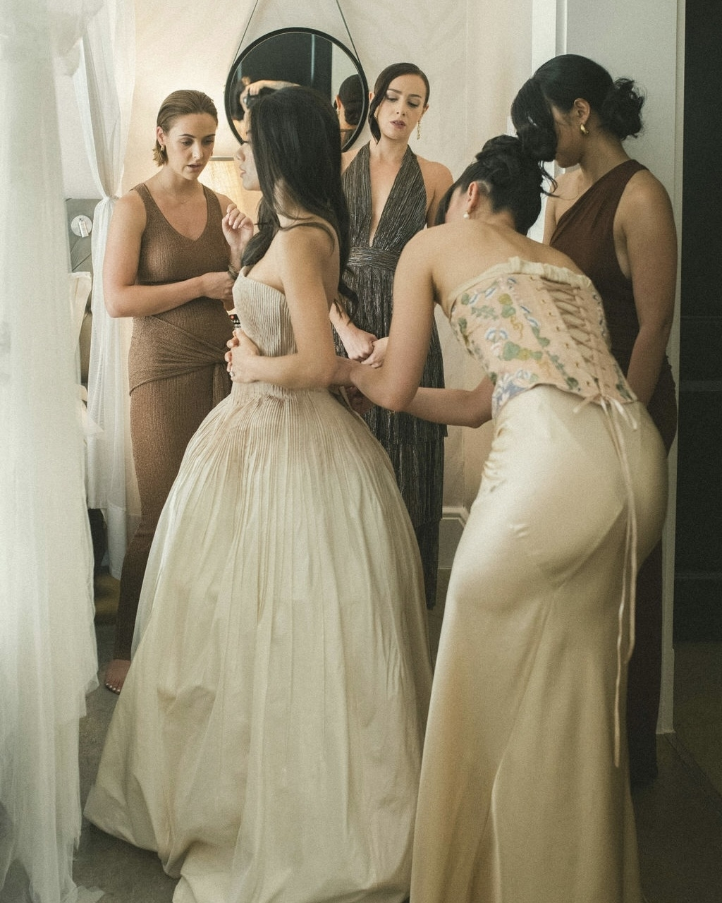 It took me several months to find the one. I tried on countless gowns, met with various designers, and even flew from Sydney to Brisbane to visit Sam at Bloom Australia and explore their collection of Danielle Frankel pieces. I had narrowed it down to a few styles I liked, but it wasn’t until Sam invited me to the Danielle Frankel trunk show in Sydney that I found Lennon – a hand-tucked silk taffeta gown in Almond, featuring a hand-dyed ombré bodice. We made custom adjustments to lower the backline and extend the train. The color was a perfect complement to my olive skin tone, and we paired the gown with a custom extension of the Pleated Malfroy and Lace veil.