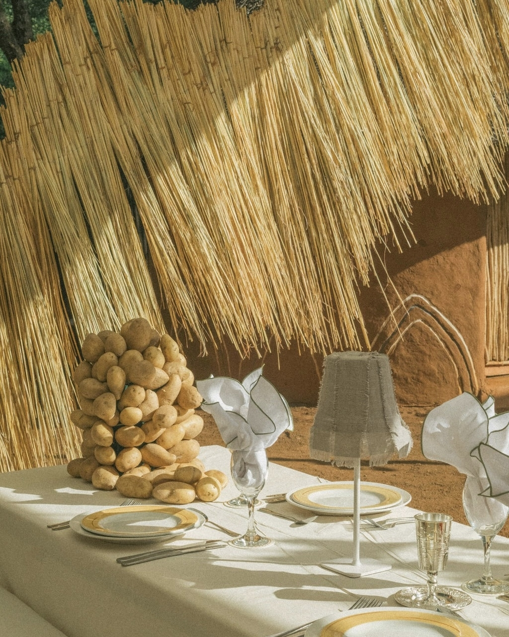 Our reception was held on the lawns overlooking the Zambezi River at the Royal Livingstone. The team built a stunningly huge fabric wall, creating a warm and intimate space for us to dine under the African stars. Chairs were once again covered with calico and satin, and the tables were adorned with bespoke handmade clay lamps.