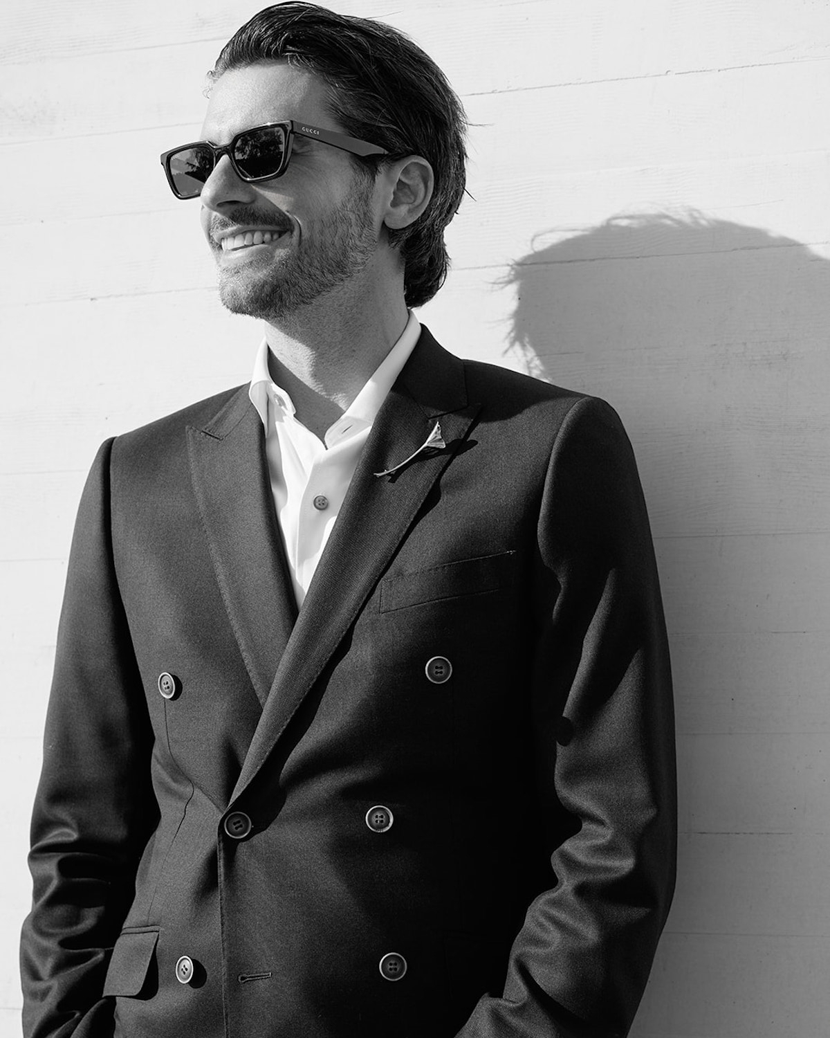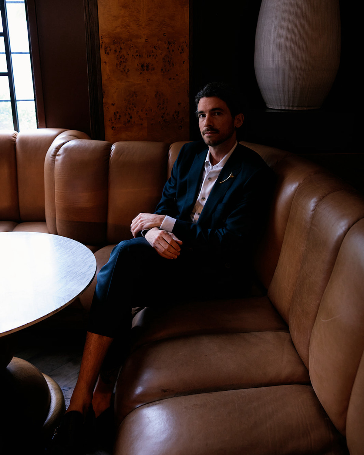 I originally wanted to commission a Nudie suit for the wedding, aspiring to look like Gram Parsons from The Flying Burrito Brothers. But I decided that might be too “look at me” for my personality. I ended up landing on a custom double-vested suit made by a Baltimore designer, Christopher Schafer Clothier. I wanted the darkest, deepest green you could find—a green so dark it’s almost black. I absolutely love how it turned out. I went for a more relaxed look, sans tie, and completed the fit with a vintage Tiffany’s Jewelry 18K Yellow Gold Ginkgo Leaf lapel pin, a gift from my beautiful bride, said to symbolize longevity and endurance. It also happens to be the tree featured within the Presidential Grove of The Reach, our reception venue. Oh, and the shoes were Ferragamo.