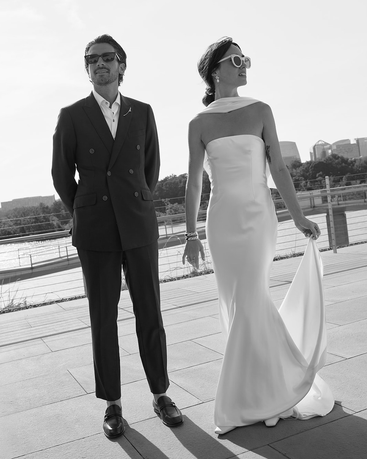 Creating a perfect wardrobe that reflected my personal style was a journey I got lost on a time or two. I knew it needed to convey fashion-forward edge, so I sought out Danielle Frankel for her vertical pleats. While that wasn’t the final direction, her team won me over when I asked them to describe their typical brides. I didn’t know my gown was “the one” in the moment, but when I scrolled through the photo library, I noticed my facial expressions were noticeably different in this understated dress, named RIVER, which just so happened to be the name of our reception venue. I love how the asymmetric scarf drapes, wraps, and falls into a detail at my low back sculpturally—it fit in nicely with the architecture of The Reach (reception campus). I also wish everyone could see the fabrication of the internal bustier’s boning.