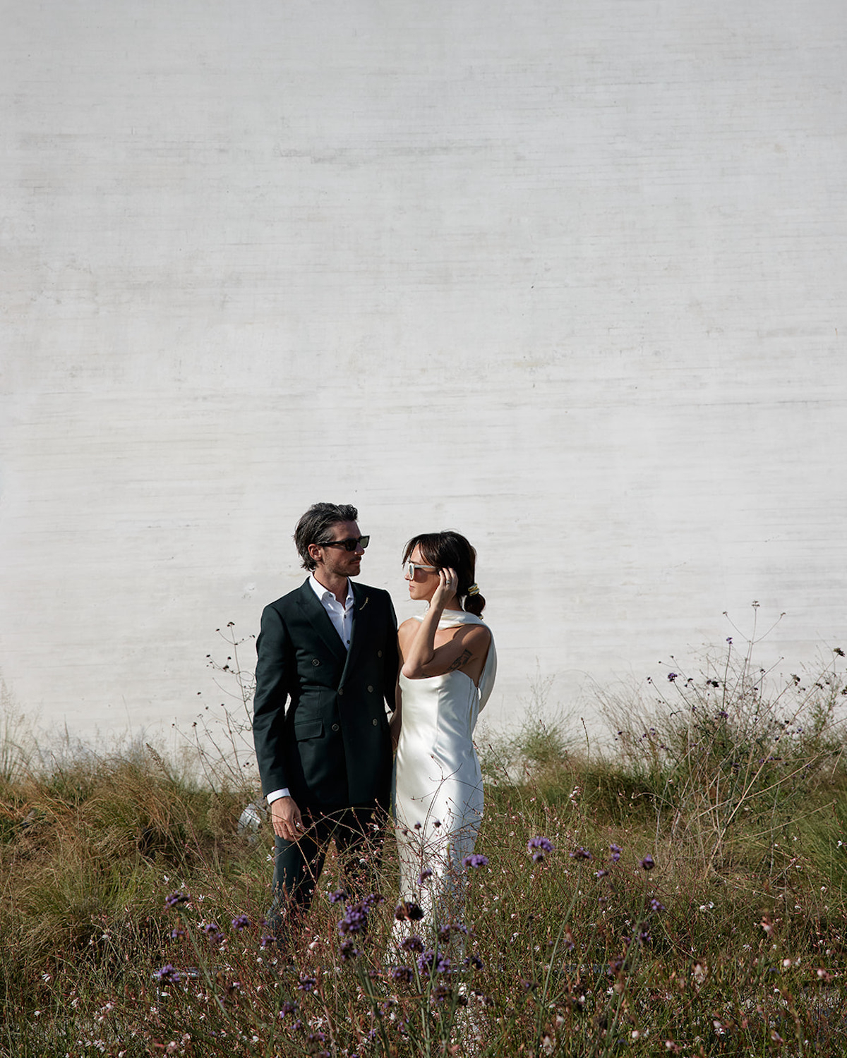 I swapped the top for another Danielle Frankel piece: the Clara tulle mock-neck topper with an open back, split wrists, and a tie at the neck to close. There’s some sentimental significance here too—our historic home is called The Clara. My somethings borrowed were worn all weekend: my late mother’s engagement ring, redesigned by me, and my great-grandmother’s wedding band. Some other accessories included Khaite sunglasses, Lelet hair hardware, and earrings from Mara Paris and AGMES. The big hit was the JW Anderson logo sculpted-heel off-white pumps and Dear Frances Cleo block-heel sandals.