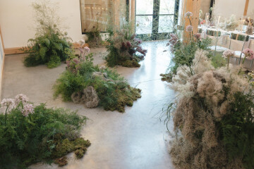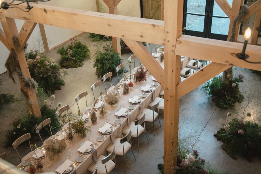 We decided to keep things intimate with a two-day celebration for just 24 of our closest family members. This gave me the chance to focus on fun and unique details to make it memorable. We wanted to enhance the property’s natural beauty without taking away from it. Aiming for timeless elegance with a bit of an unexpected twist, we chose a theme that mixed fluffy, soft florals with earthy elements, all while keeping sustainability in mind.