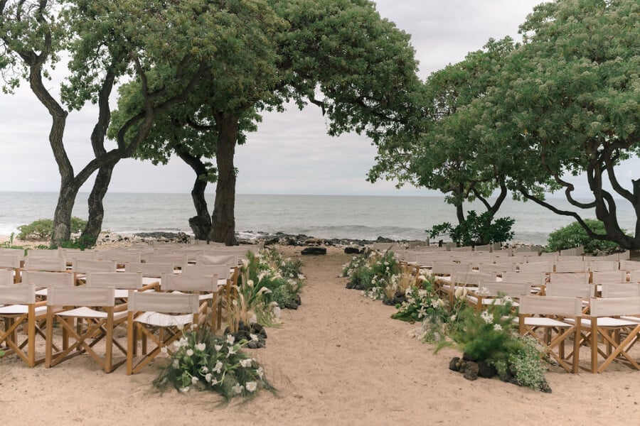 Our wedding weekend was a love letter to the land and sea. Alex and I both share a deep love for the beach, and every detail reflected the ocean, nature’s soft textures, and Hawaii’s organic beauty. At the heart of our vision was a black-tie, toes-in-the-sand ceremony, set against the natural landscape of Kona’s shores. From scallop shell butter dishes to earthy florals, our minimalistic, sea-inspired touches echoed the colors, elements, and gentle rhythm of the ocean.