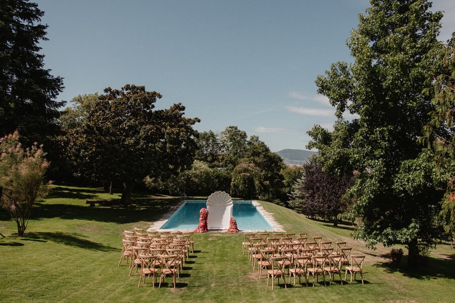 Today, the next generation has adapted the farmhouse to meet modern needs while staying true to its origins and respecting the natural environment it was designed to embrace. The house and its kitchen reflect Basque tradition and heritage, while the pool and lush green exterior spaces brought to mind memories of Servando’s family home in Panama. The ceremony was held outside, with a large shell behind us, that we exchanged our vows and began our journey together.