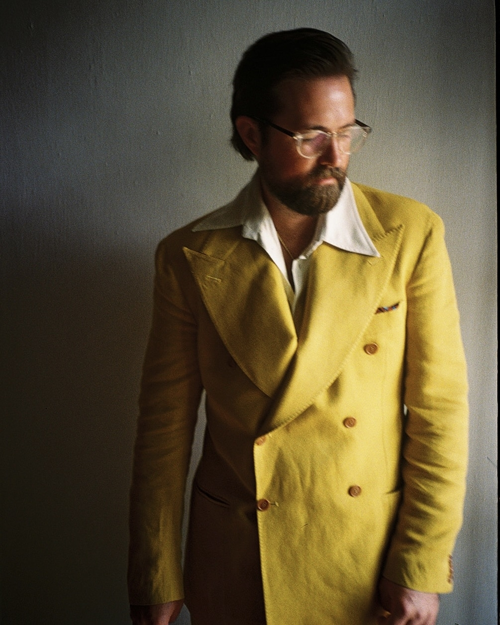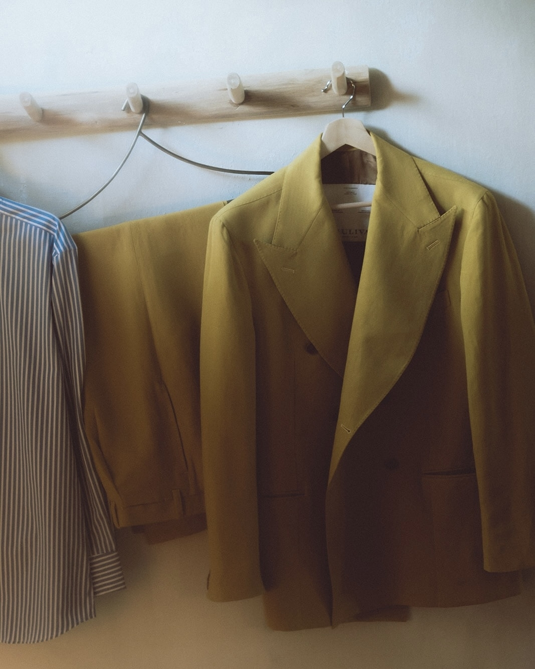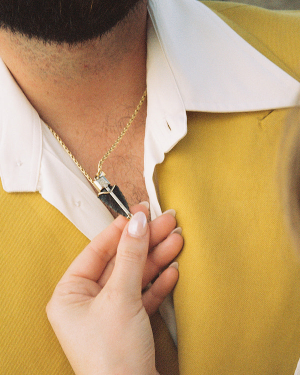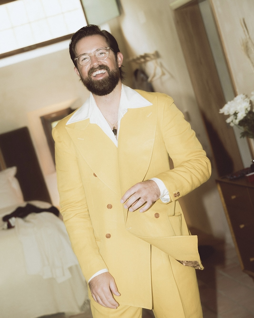 Andrew curated his welcome party outfit around a custom "seed packet" shirt by kpc., an independent designer known for crafting garments from carefully sourced deadstock fabrics. He paired it with tailored trousers from Knickerbocker and fisherman sandals by Jacques Solovière. Avoiding tradition and formality, Andrew sought a wedding suit that was playful yet refined. He found it in the bold color and dramatic lapels of his Giuliva Heritage ensemble. Paired with a breezy silk shirt from Post Romantic Co. and Carmina loafers, the outfit exuded laid-back sophistication. A vintage Longines watch, a gift from his late father, added sentimental flair, while all custom jewelry by Mariah Thornton completed the look.