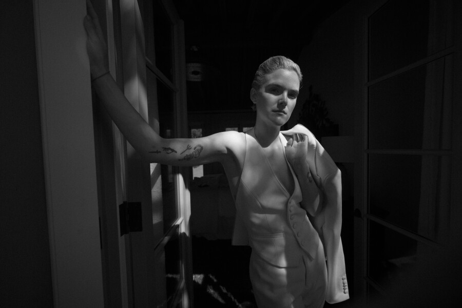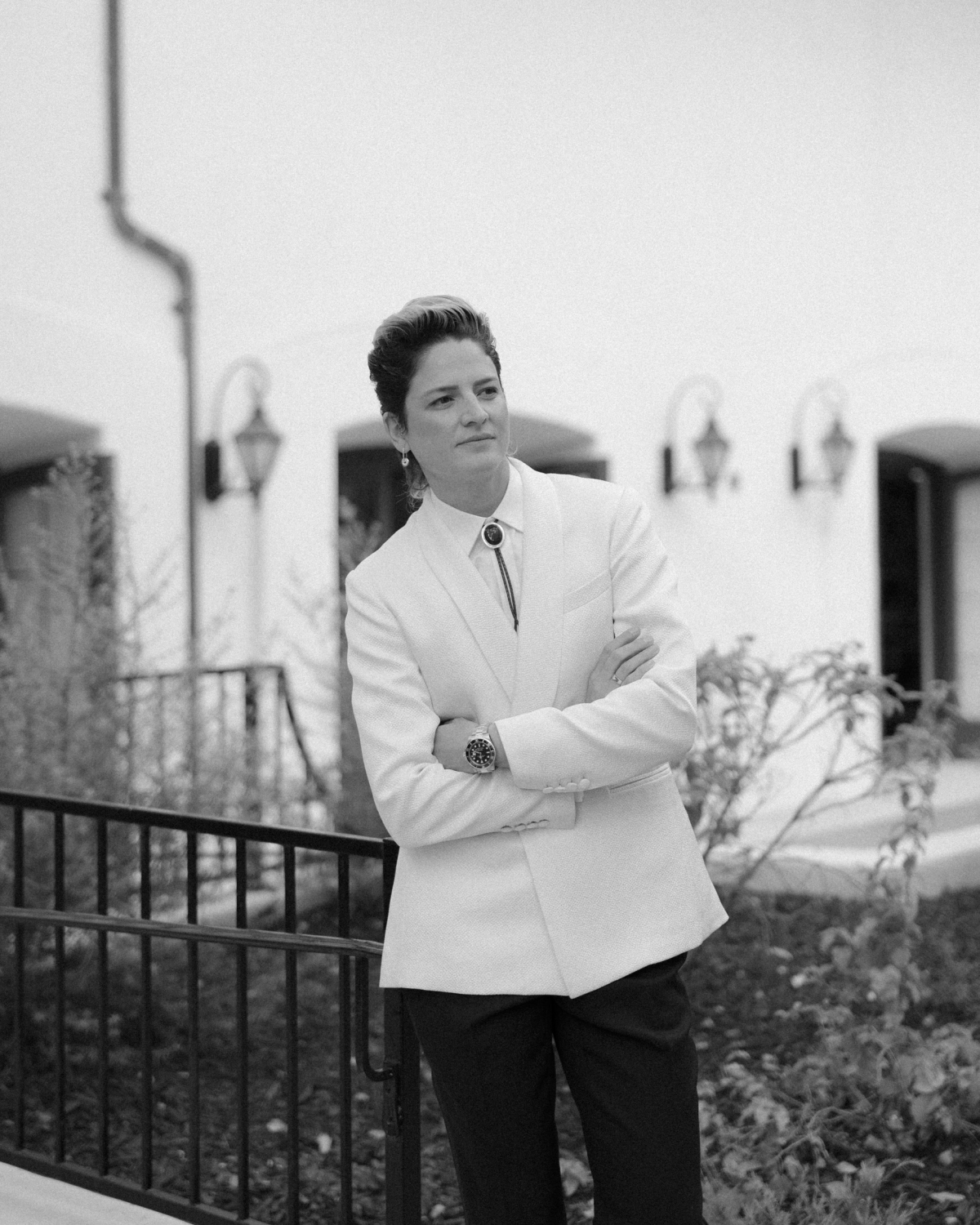We both knew we wanted to wear suits, and Josie did a ton of research to find someone in NYC who could pull off our wild ideas. She found Watson Ellis, and they made our dreams come true. I wanted a traditional white tuxedo, like Humphrey Bogart in Casablanca. After some persuasion, Kat and Melissa at Watson Ellis convinced me to modernize it with dark navy pants and a white crushed silk jacket. The fabric gave the jacket an understated shimmer—much more interesting than a flat white.