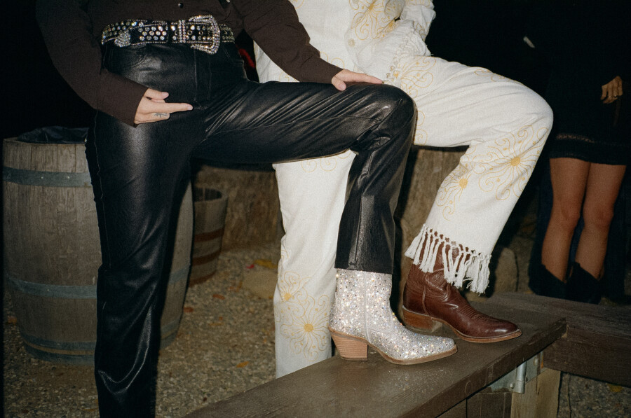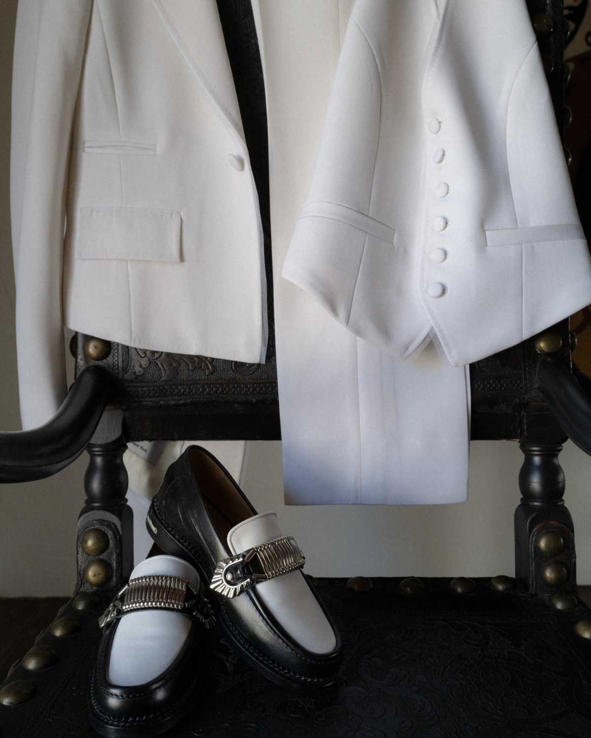For Josie’s suit, she wanted western influences. We added subtle nods to western wear: deep-V shoulder piping, side buckle straps on the trousers, and an absurd number of buttons. Melissa also cleverly piped tulle around the vest and coat edges, adding beautiful dimension.