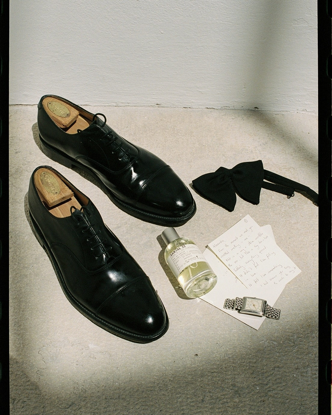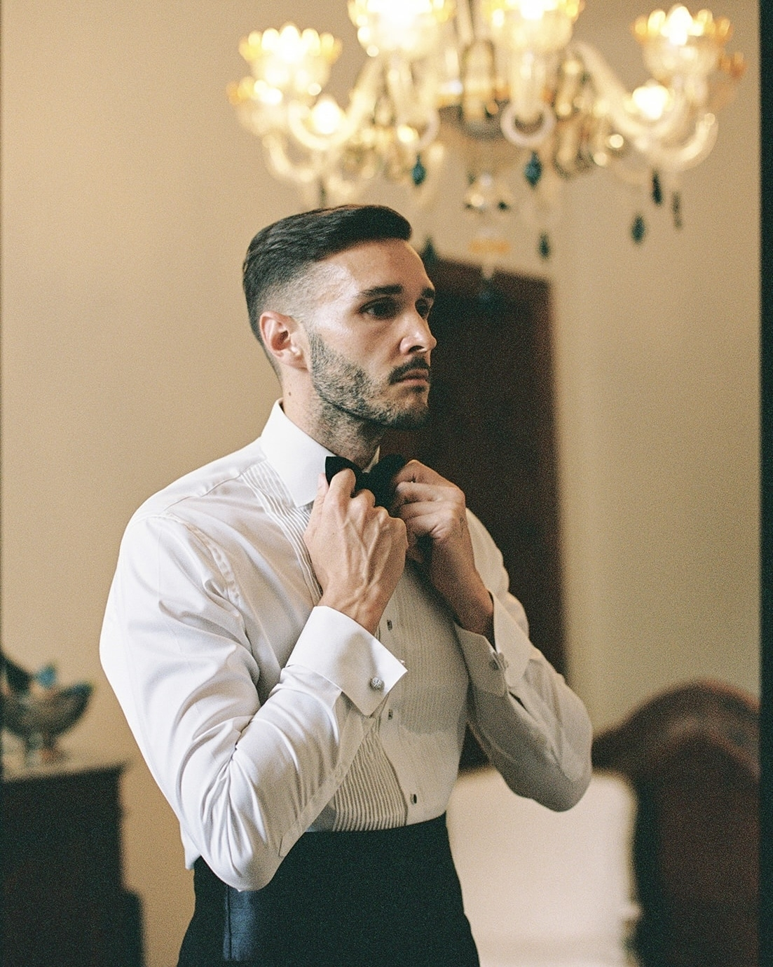 Charles favours a classic black-tie style—timeless and free from trends. Working with Giuliano at Suited & Booted in Dubai, he wore a black shawl-lapel jacket with a white rose boutonnière for the ceremony, complementing my gown. After dinner, he changed into a white dinner jacket with a traditional lapel and a red rose boutonnière for cake-cutting and dancing. Both looks were pure old-school elegance, elevated with subtle details true to Charles and the timeless feel of the day.