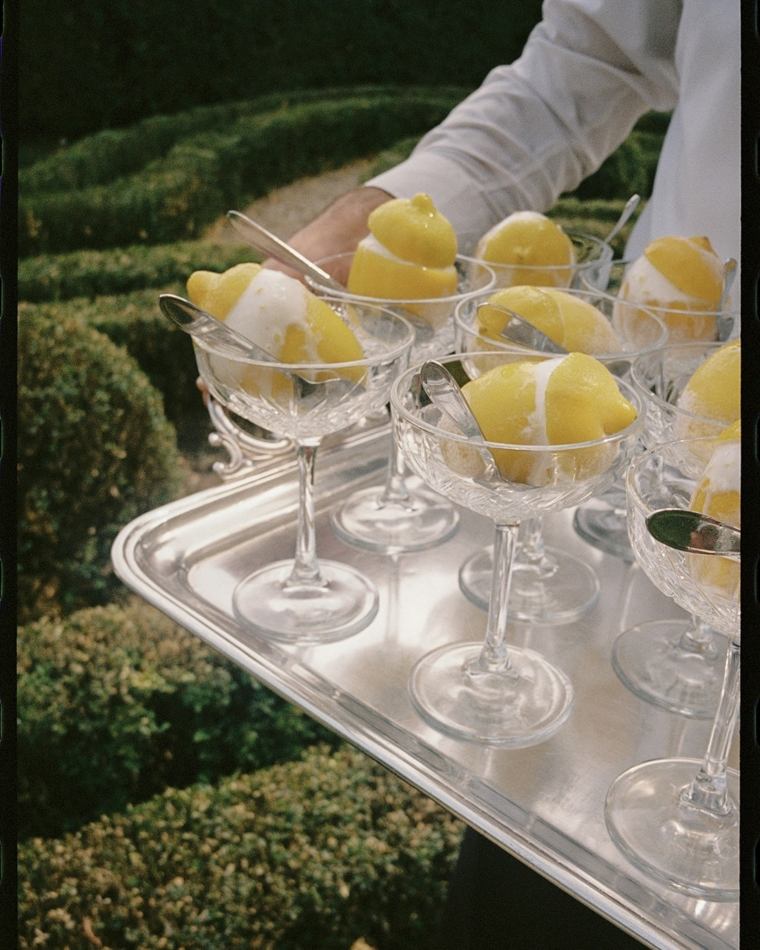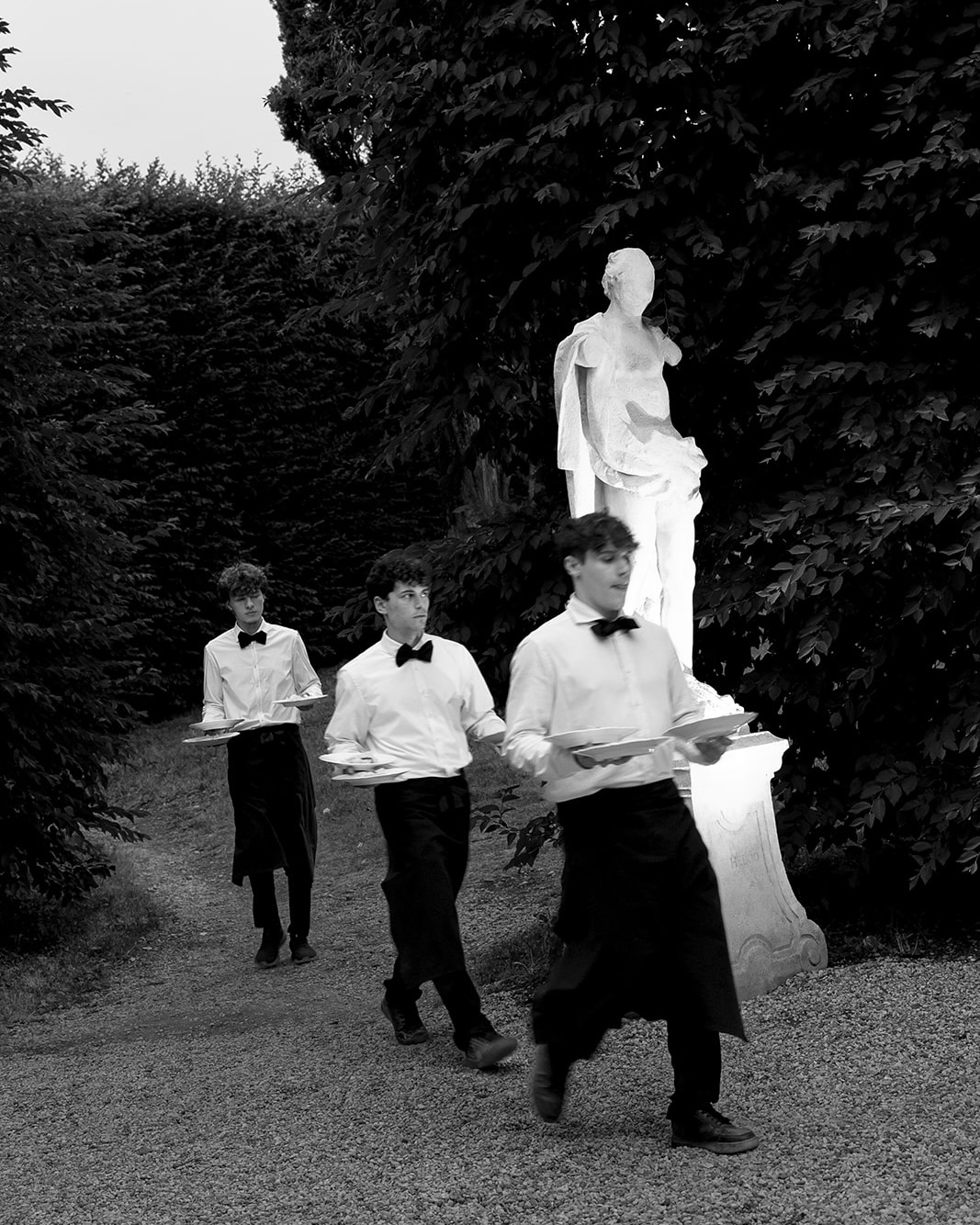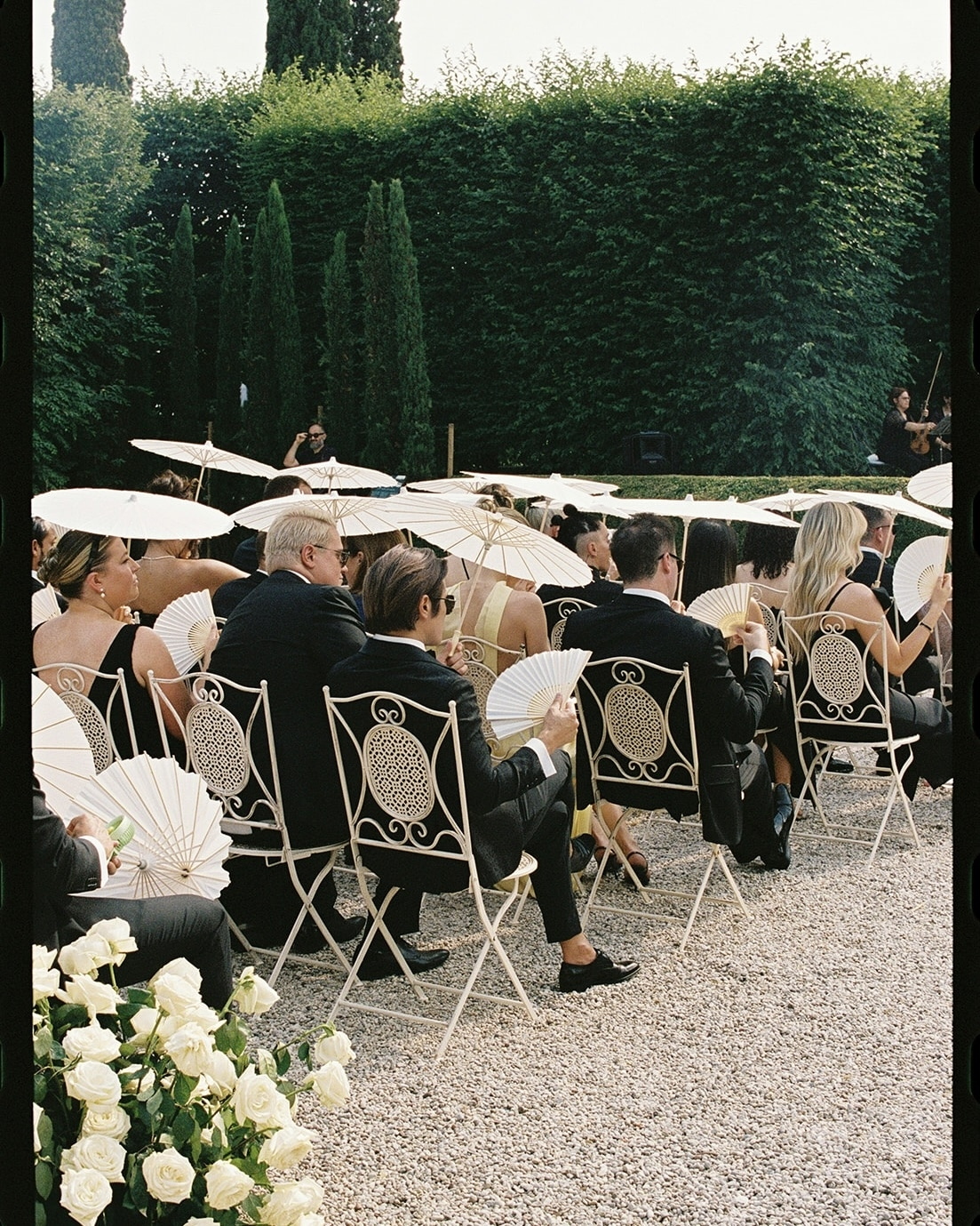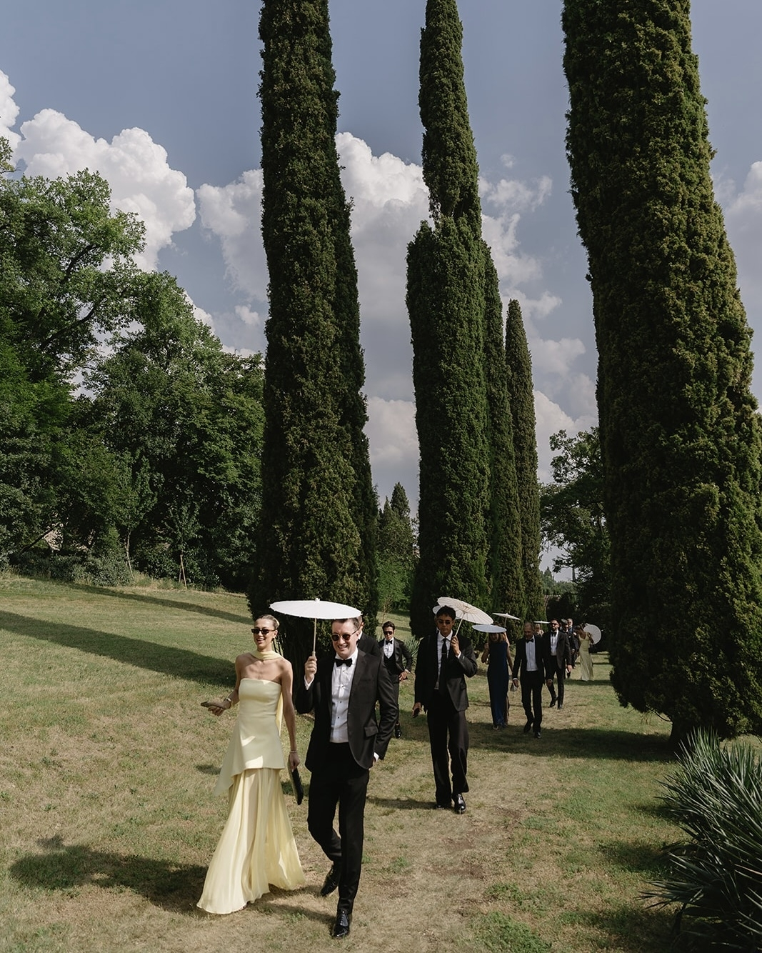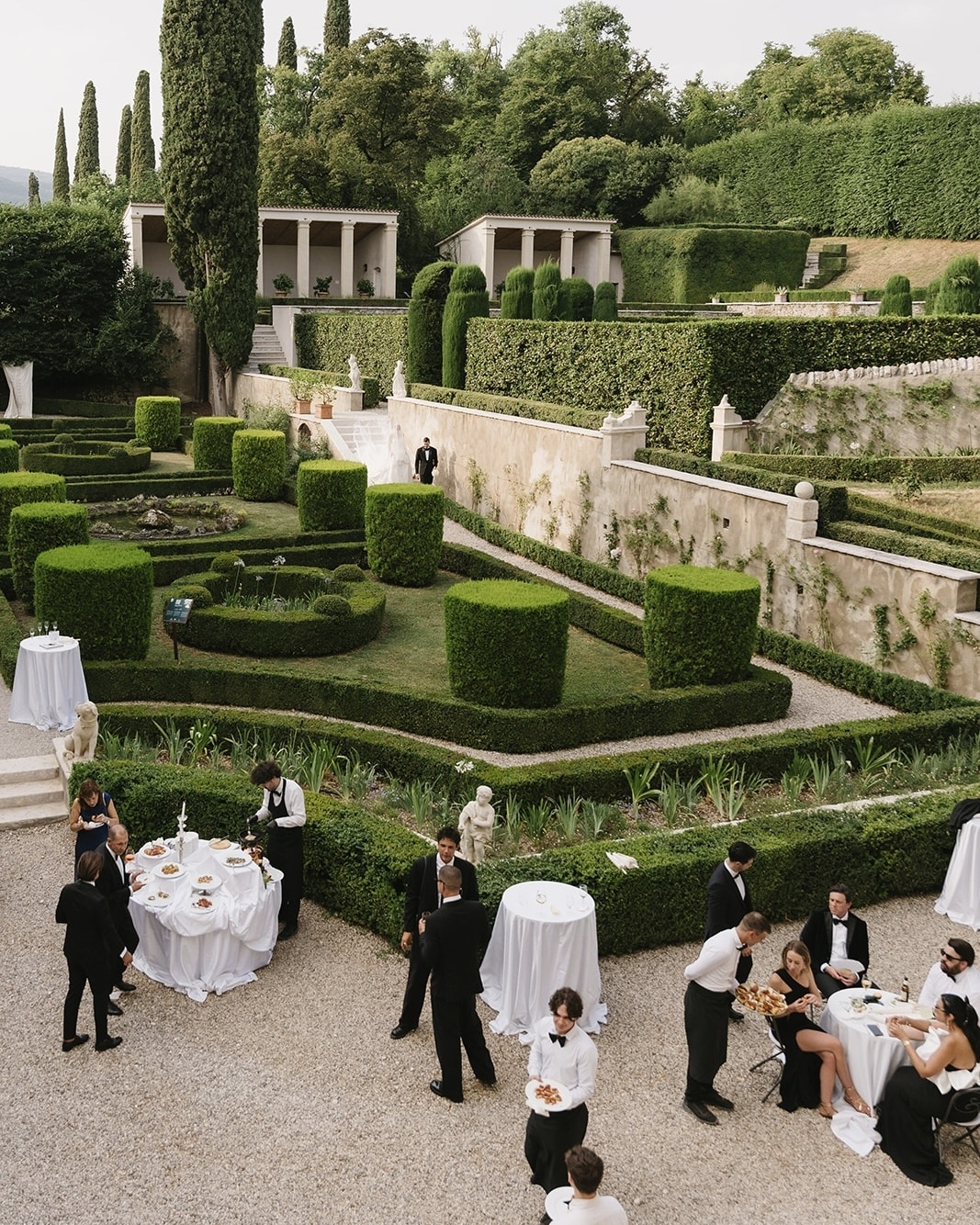 On the wedding day, guests arrived at the venue in the late afternoon and gathered in the Limonaia area, enjoying welcome drinks and refreshing lemon sorbet. Charlie then led guests down a 90-metre path framed by towering cypress trees into the breathtaking amphitheatre. A string trio played softly, setting a romantic and timeless tone for the moment.