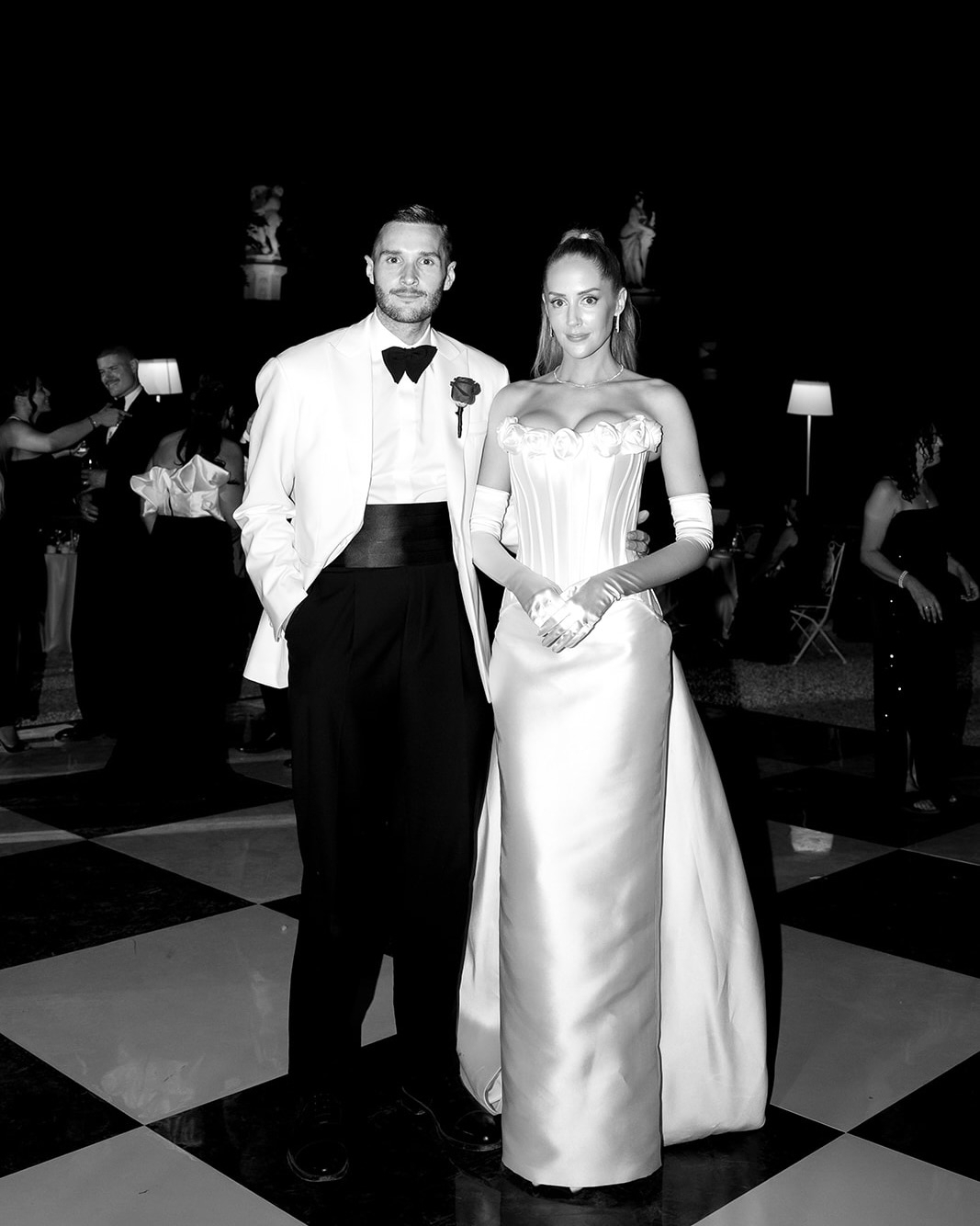 We decided to keep our bridal party intimate, with just our best friends as maid of honour and best man. With our black-tie dress code, I knew a classic black gown would be timeless and sophisticated for my best friend. I wanted her to feel completely comfortable and beautiful, so I gave her the freedom to choose any style she loved. We ultimately landed on a House of CB gown with a structured corset and elegant draping. She wore the pearl earrings I had worn to our intimate Melbourne civil ceremony earlier in the year and carried a petite bouquet of white roses that matched mine. For the best man, we wanted to keep things ultra-classic and understated, in keeping with the black-tie dress code. He wore a traditional tuxedo that looked effortlessly sharp and perfectly suited to the elegance of our setting.