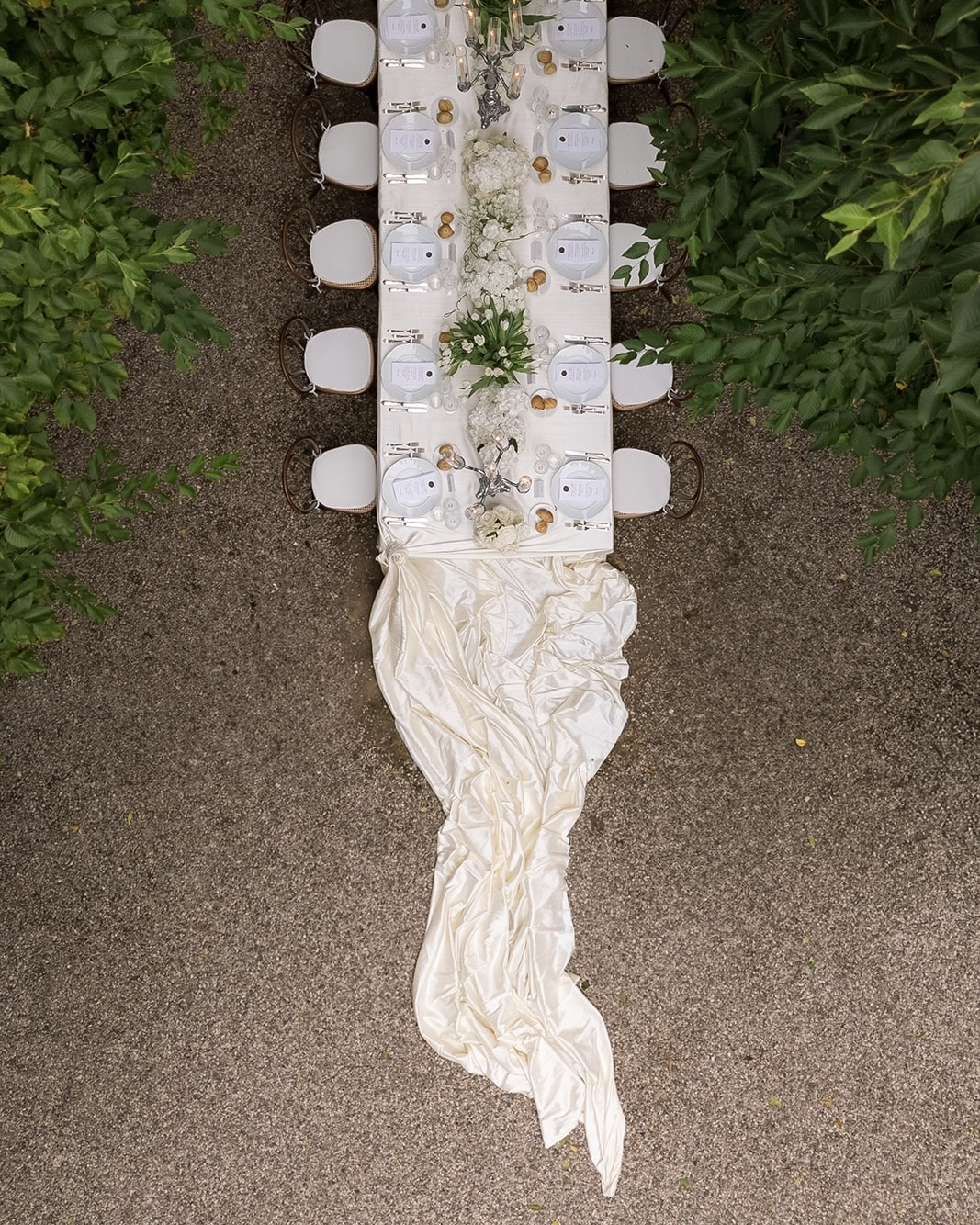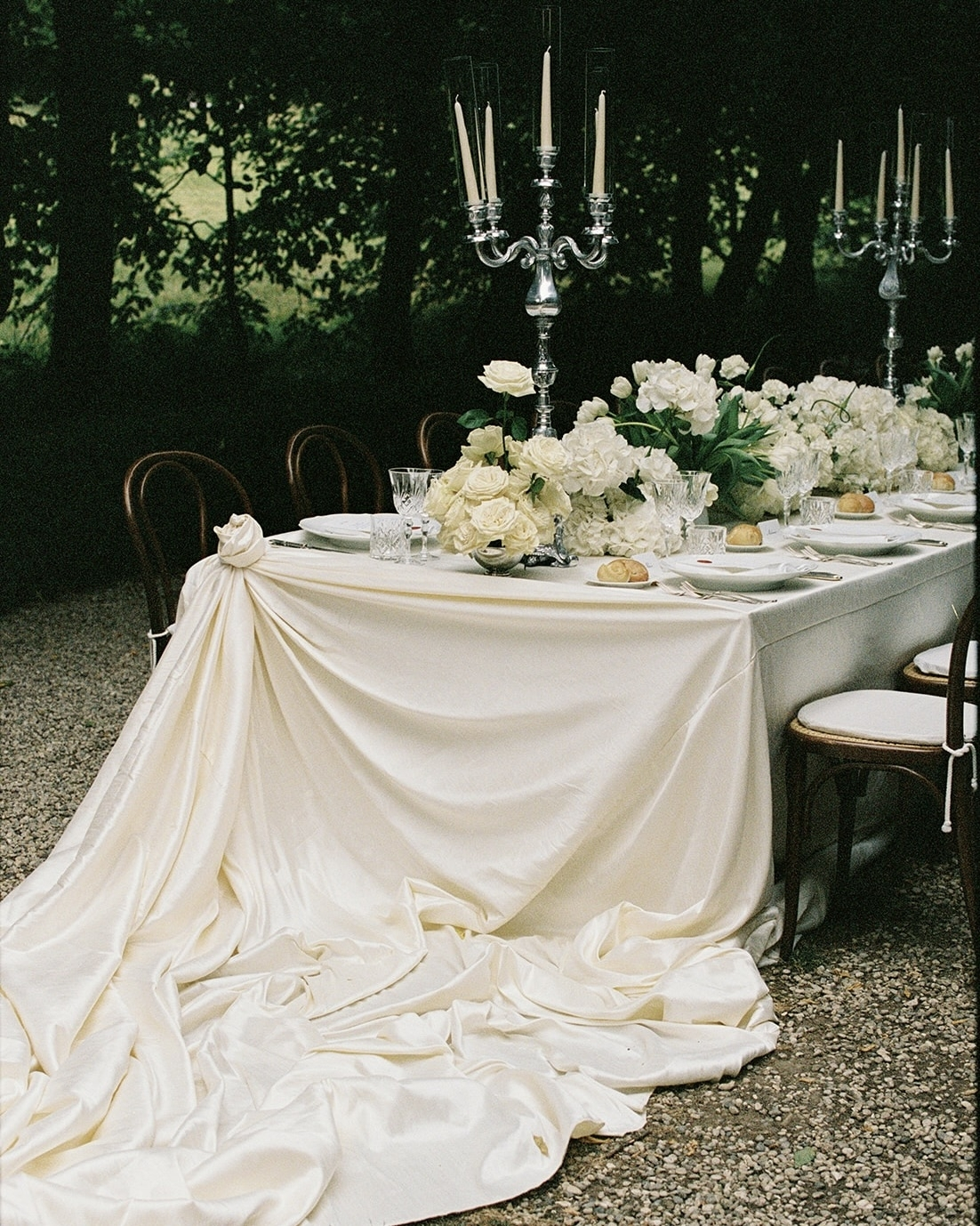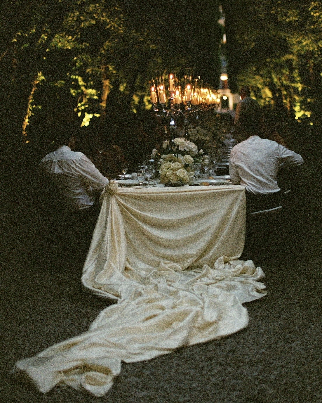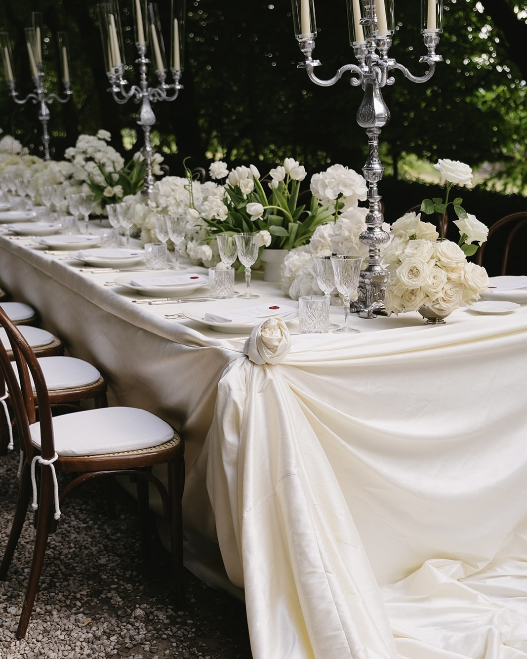Our reception dinner was set at one long table beneath a tree-lined gallery—dreamlike and intimate. Guests found their seats via a four-metre silk seating chart draped from the trees, adding a touch of theatre. Evebud styled the table with white florals in vintage silver vases, grand candelabras, and a 40-metre silk cloth gathered into rose shapes at each end—a nod to our floral motif. I designed the menus myself, sealing each with a red wax rose to match our invitations.