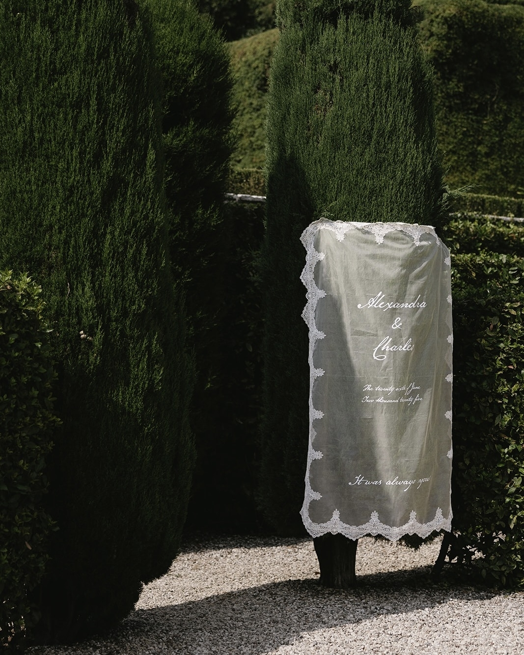 With my background in marketing and events, I had a clear creative vision for the day and knew exactly how to bring it to life. I wanted our wedding to feel romantic, intimate, timeless, and elegant, with every detail carefully considered. I leaned into vintage romantic elements throughout—from my dress to stylistic choices—and drew inspiration from iconic weddings in history to help shape our design direction. Rich textures like silk and lace added depth, while every styling element, from tablescapes to signage, was curated to feel cohesive and intentional. Our florals and styling were designed to feel organic to the space, with understated elegance and sculptural elements that brought a sense of refinement without ever feeling overdone.