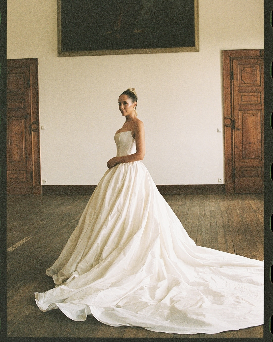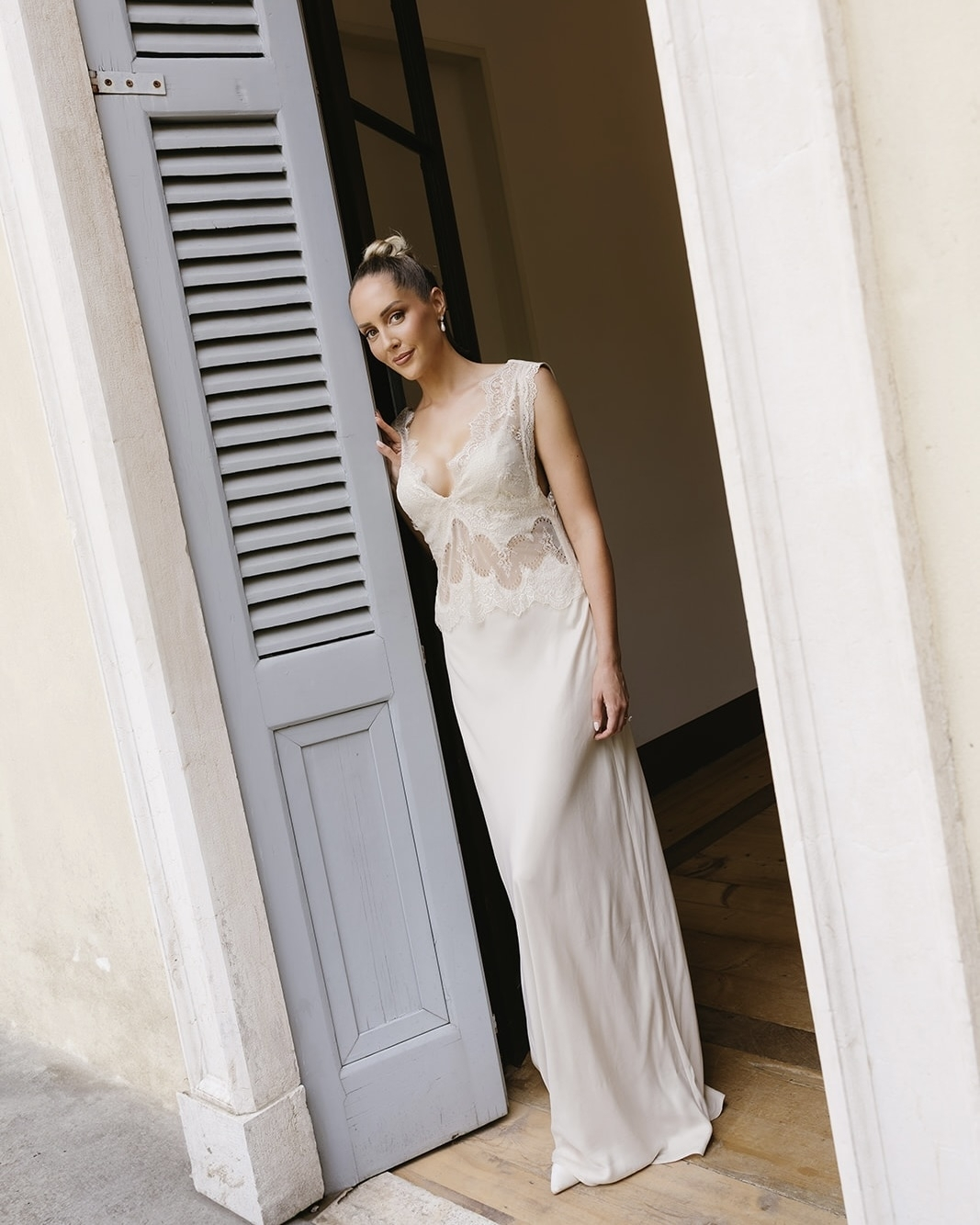 I paired it with a custom four-metre veil from Aston Bridal, edged in vintage lace, and wore the blusher for a traditional, emotional walk down the aisle. For the reception, Aston created a corset with exposed boning and oversized rosettes, paired with a Mikado column skirt and a French bustle—a Regency-inspired silhouette. Ivory opera gloves and pointed satin-and-lace heels completed the look. Jewellery was custom for each moment: diamond-and-pearl drop earrings for the ceremony, two-tier diamond drops for the reception, and a surprise graduated tennis necklace from Charles on the wedding morning. My hair was styled by my close friend Rhys Harrison—sculptural French twist for the ceremony, sleek half-up for the reception. Makeup artist Carla Dyson created a natural-yet-glam look in soft neutrals, refreshing my base in under ten minutes despite the 39-degree heat.