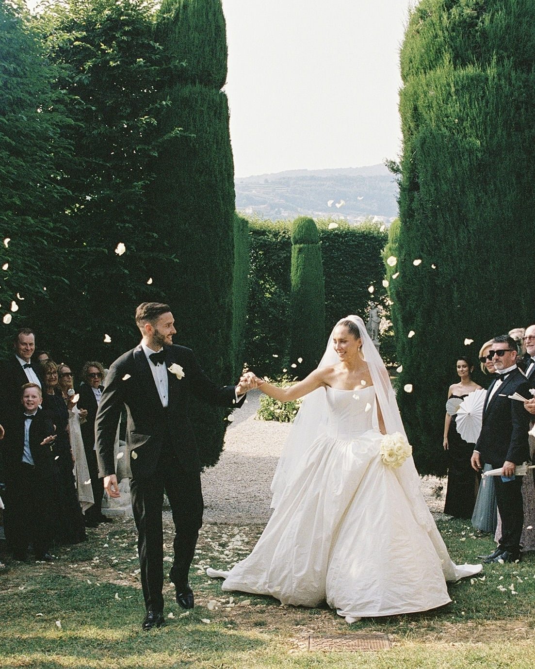 From the scalloped draping at the villa entrance to lemon sorbet served in hollowed lemons, every detail was considered. Instead of a guest book, friends signed a coffee-table book on love, leaving notes alongside iconic imagery. In honour of Charles’ business, Humantra, we gifted “Love Potion” boxes of electrolytes with copy rewritten to reflect our story—perfect for post-party recovery. Roses, my favourite flower and a symbol of our relationship, appeared throughout the day, even on my second dress. Our cake, inspired by Jackie Kennedy’s and adorned with white roses, tied the celebration together in timeless elegance. Every touchpoint was designed to make guests feel special—from the first sip of prosecco to the final dance.